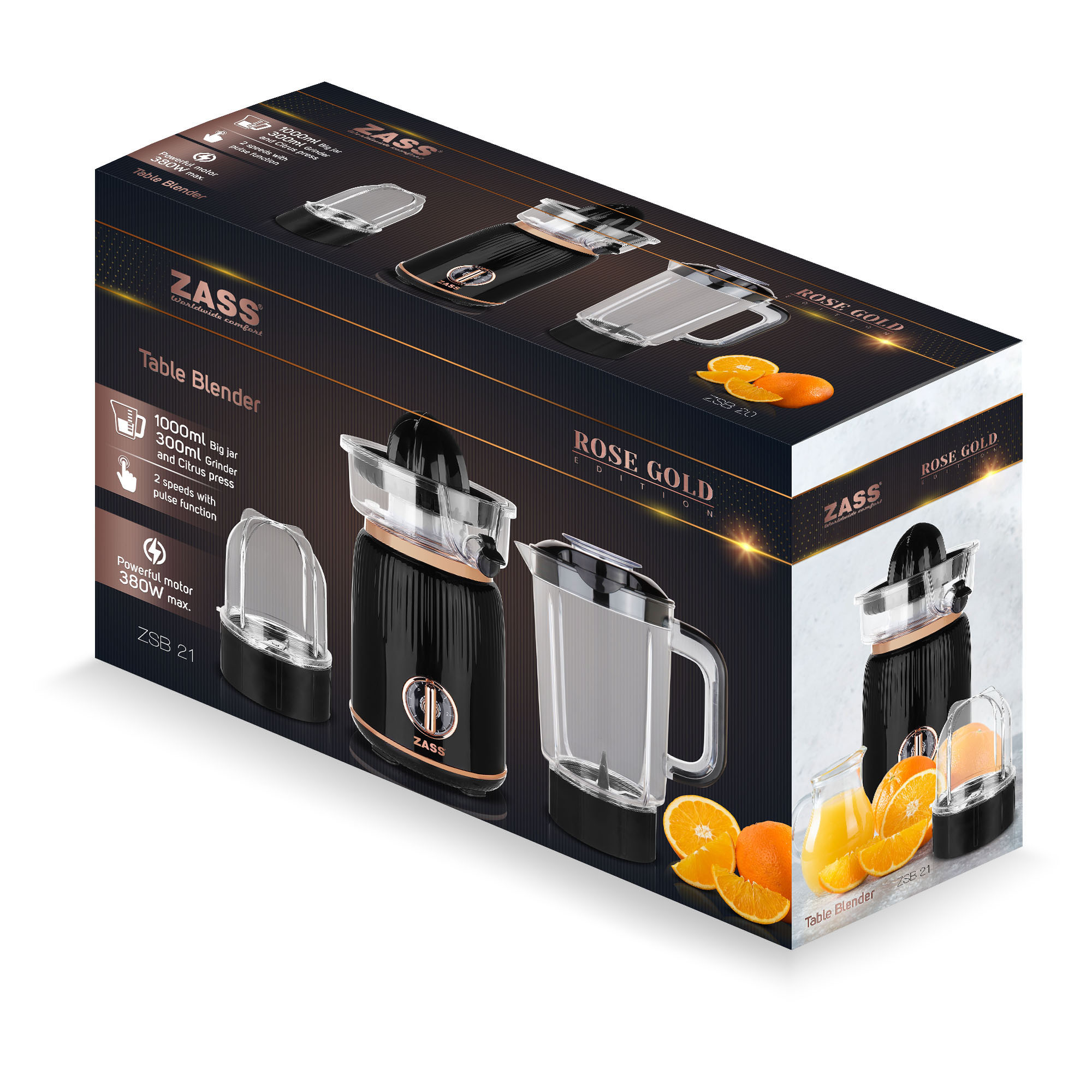 Alege un blender multifuncțional potrivit pentru bucătăria de zi cu zi, elegant și ușor de folosit. Modelul ZASS ZSB 21 Rose Gold combină funcțiile de blender de masă, râșniță și storcător de citrice, ca să prepari rapid smoothie-uri, sosuri, creme, condimente măcinate sau suc proaspăt. Designul retro cu accente rose gold oferă un plus de stil, iar motorul din cupru asigură performanță constantă.