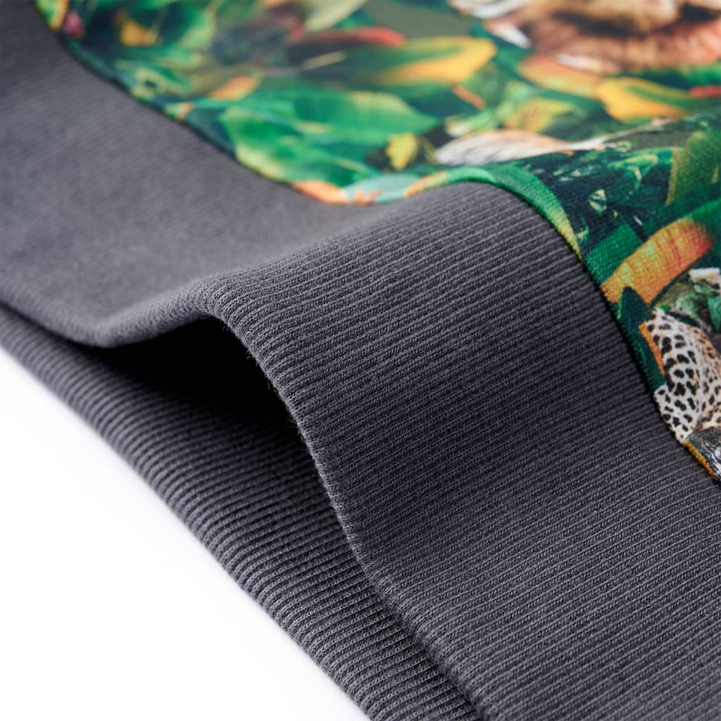 Acest bluzon pentru copii are mâneci lungi, decolteu rotund și margini cu model din elastic împletit la manșete, în jurul gâtului și în partea inferioară. Bluzonul pentru copii este imprimat cu animale și plante peste tot. Bluzonul pentru copii sunt confecționați din material moale care include 95% bumbac și 5% elastan, pentru confort și respirabilitate.