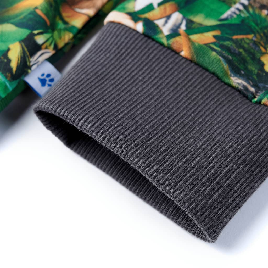 Acest bluzon pentru copii are mâneci lungi, decolteu rotund și margini cu model din elastic împletit la manșete, în jurul gâtului și în partea inferioară. Bluzonul pentru copii este imprimat cu animale și plante peste tot. Bluzonul pentru copii sunt confecționați din material moale care include 95% bumbac și 5% elastan, pentru confort și respirabilitate.