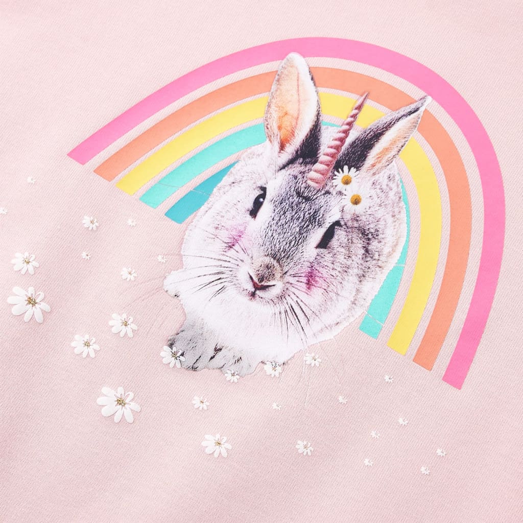 Acest bluzon pentru copii are mâneci lungi, decolteu rotund și margini cu model din elastic împletit la manșete, în jurul gâtului și în partea inferioară. Bluzonul pentru copii prezintă un curcubeu și un iepure pe partea din față. Bluza pentru copii este confecționată din bumbac și elastan, pentru confort și respirabilitate.