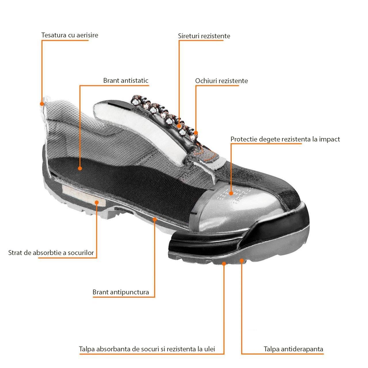 - Clasa de protectie a ghetelor: S1P (bombeu rezistent la impact, talpa anti-derapanta, zona de acoperire a calcaiului inchisa, absorbtia energiei in zona calcaiului, proprietati antistatice, talpa rezistenta la penetrare)