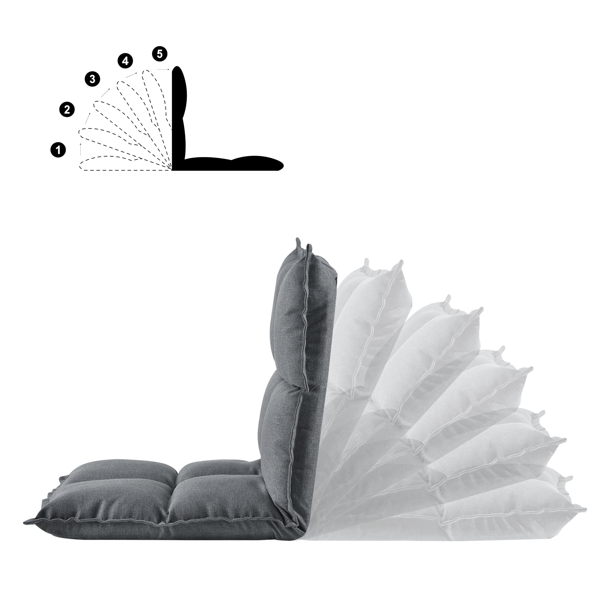Die Lehne lässt sich in fünf Stufen verstellen, für Ihre optimale Wunschposition. Zusätzlich lässt sich die Lehne auch komplett auf 180 Grad verstellen, um das Bodenkissen als Liege zu verwenden.