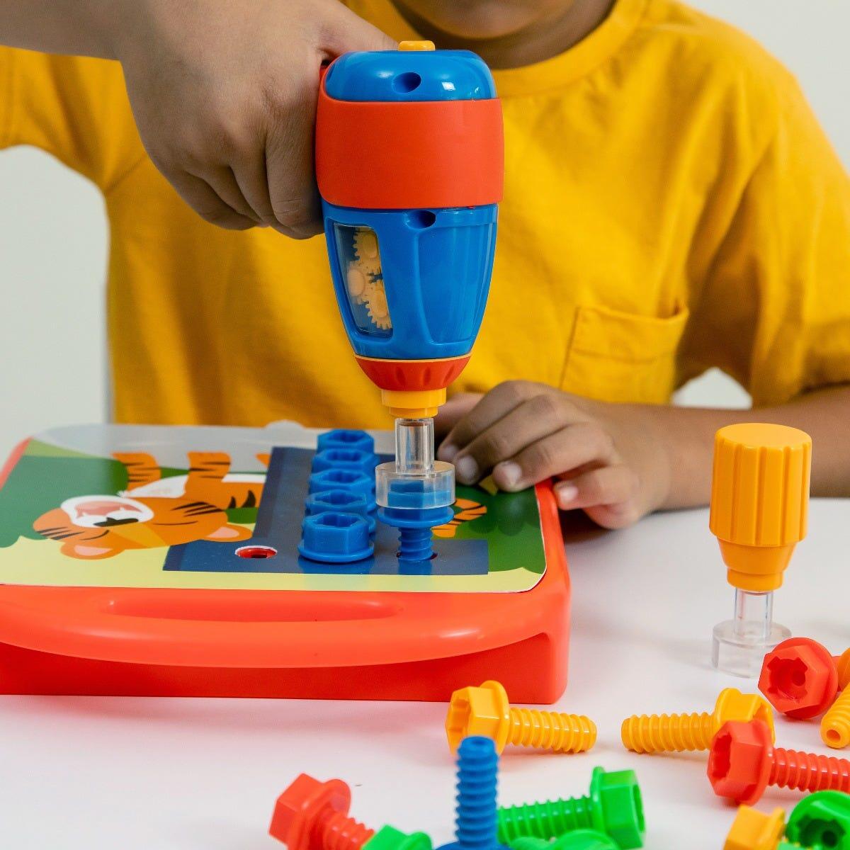 - Conține: tăbliță Design & Drill, bormașină electrică, șurubelniță, 50 de șuruburi colorate, 10 carduri față-verso cu numere, 26 de carduri cu litere, ghid de activități