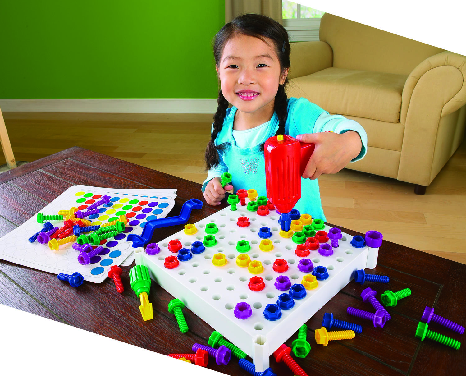 Mod de utilizare: copilul alege un model de pe card sau creează unul propriu, apoi folosește bormașina, șurubelnița manuală sau cheia fixă pentru a fixa șuruburile din plastic pe tabla de joc. Funcțiile de înșurubare și deșurubare fac joaca mai realistă și mai antrenantă.