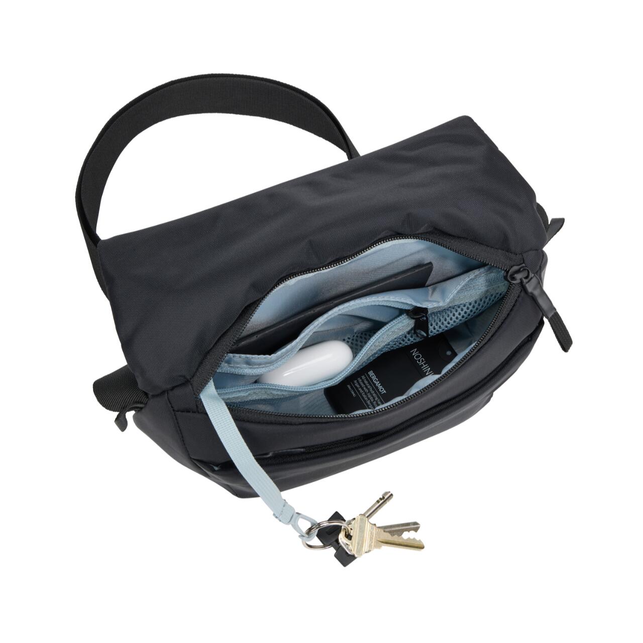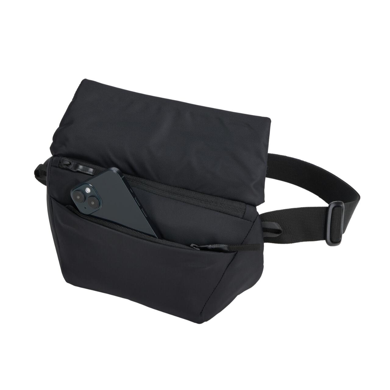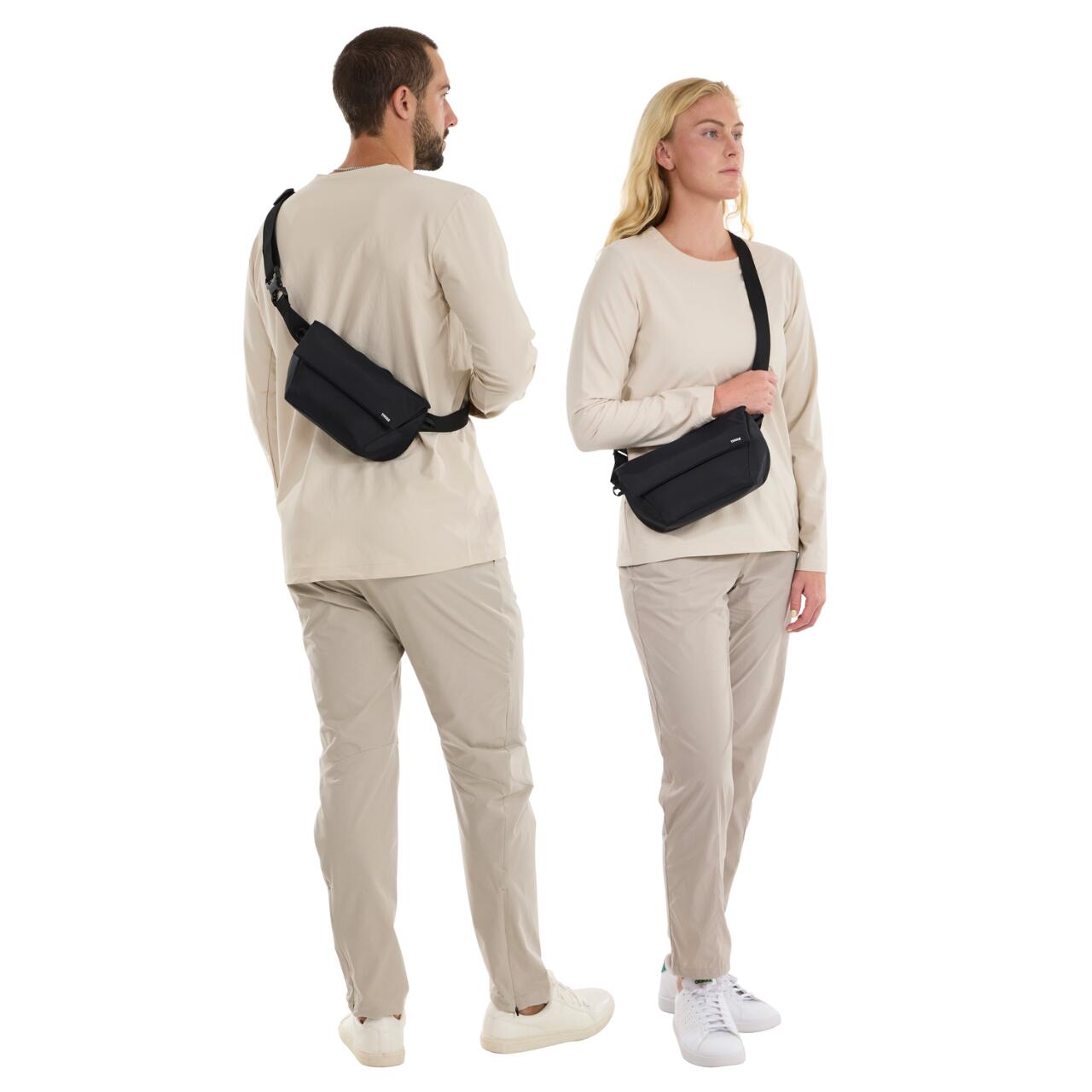 Poate fi purtata ca geanta sling sau in jurul taliei.