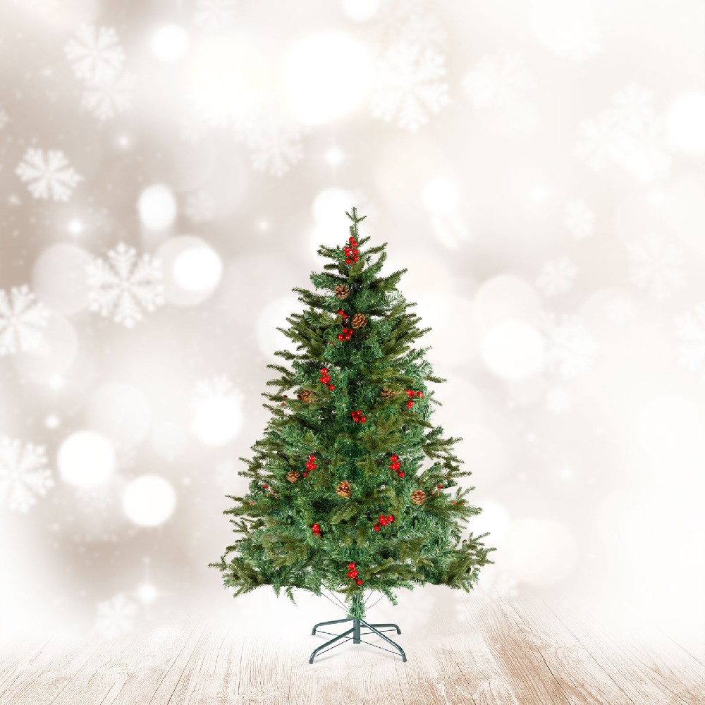 Adaugă un plus de eleganță sărbătorilor tale cu acest brad artificial de 120 cm, decorat cu bobițe roșii. Ramurile bogate, realizate dintr-un amestec de PE și PVC, imită perfect frumusețea unui brad natural, iar micile accente roșii oferă un farmec distinctiv și festiv.