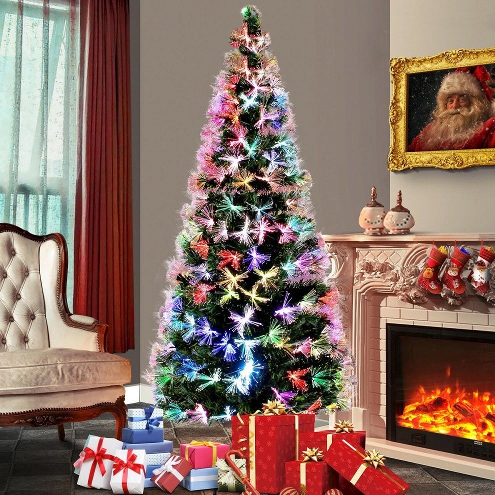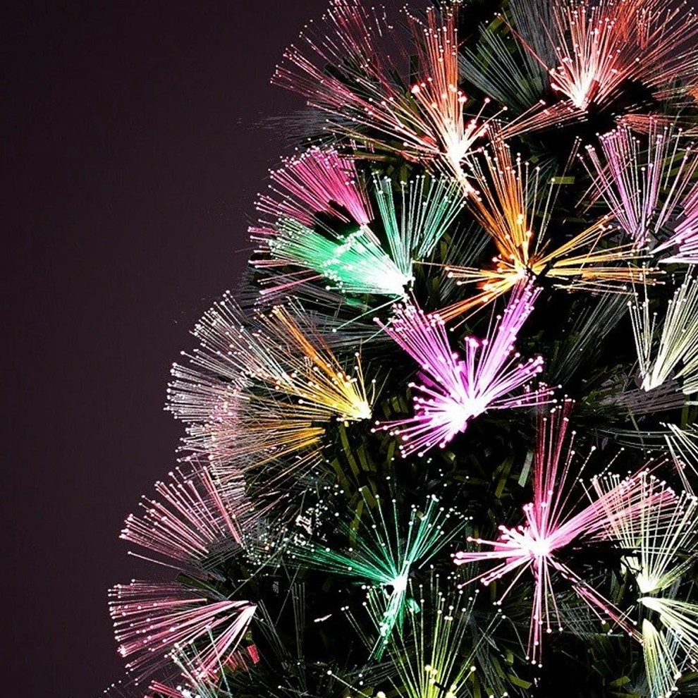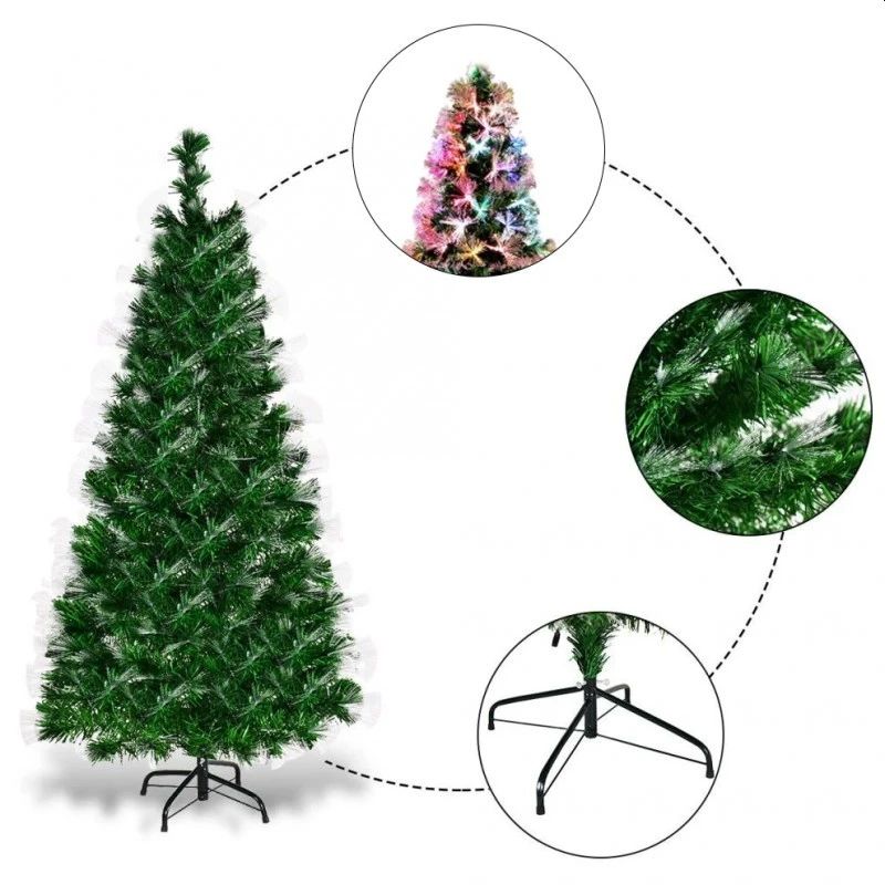 Brad artificial 210 cm cu fibră optică multicoloră și suport metalic, ramuri flexibile