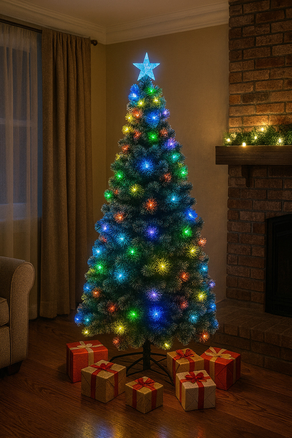 Unul dintre cele mai mari avantaje ale acestui model este sistemul de iluminare integrat. Lumina LED combinata cu fibra optica creeaza un joc multicolor fascinant, care schimba subtil nuantele si adauga un efect wow instantaneu. Nu mai ai nevoie de instalatii suplimentare, cabluri sau becuri separate – totul este gata de utilizare imediat ce bradul este montat, economisind timp si efort.