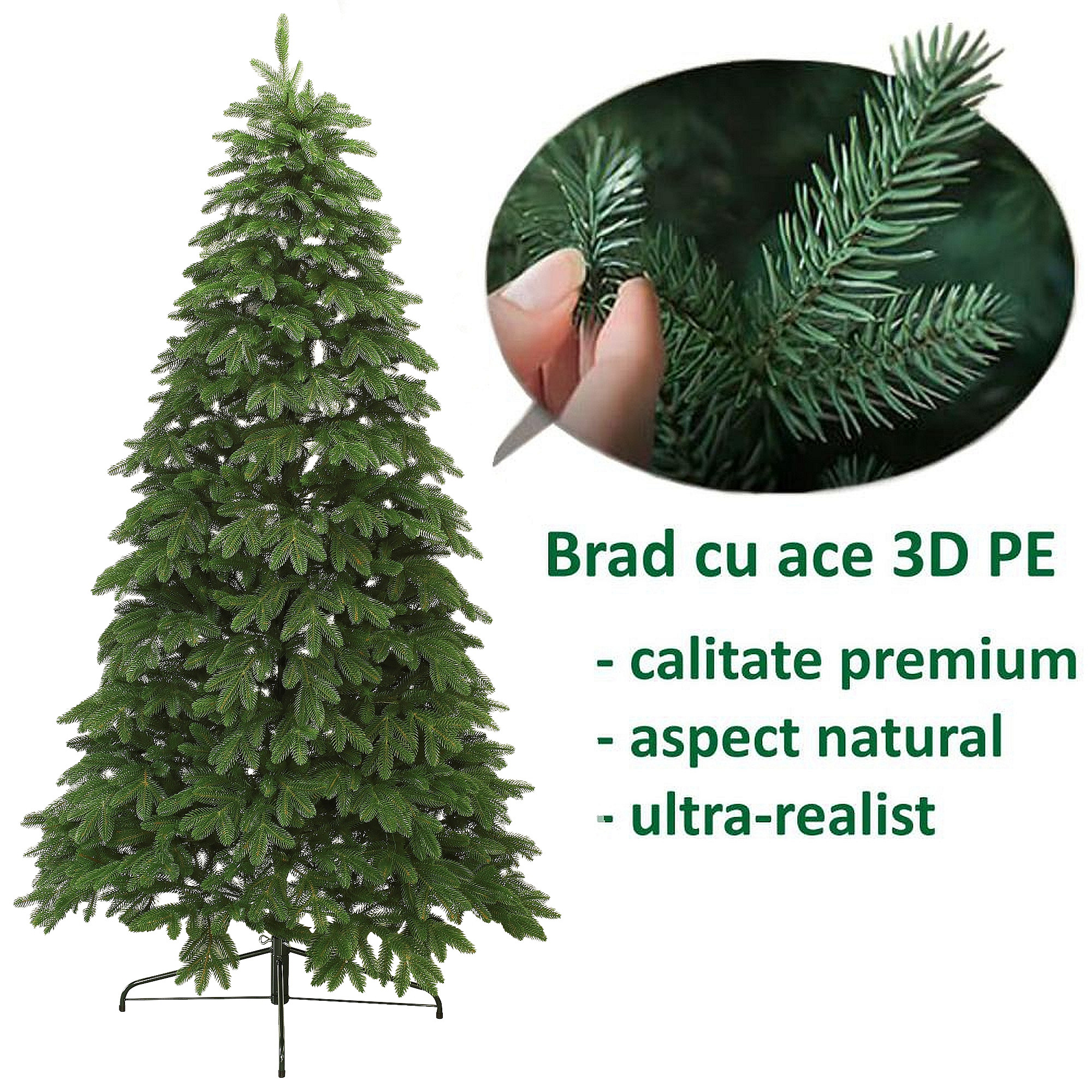 Fiecare ramura este conceputa pentru a imita cu fidelitate forma si textura acelor naturale de brad. Acele nu sunt fabricate din folie PVC, ca la brazii clasici, ci sunt turnate tridimensional. Tehnologia 3D permite bradului sa para mai plin si mai bogat. Pentru a fabrica acesti brazi artificiali premium cu ace 3D PE este folosita cea mai noua tehnologie prin care se toarna polietilena (PE) in matrite si astfel iau nastere parti intregi de crengute tridimensionale (3D) cu aspect ultra-realistic. Gratie acelor 3D de cea mai inalta calitate, acest brad este imposibil de diferentiat de un pom natural. Acestia se potrivesc perfect in interioare de lux dar si traditionale. Acest brad artificial cu ace de conifere 3D va arata foarte real si, prin aspectul sau, ii va uimi pe prieteni si cei apropiati care nu-si vor putea lua ochii de la pomul dumneavoastra de iarna!