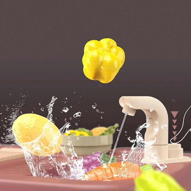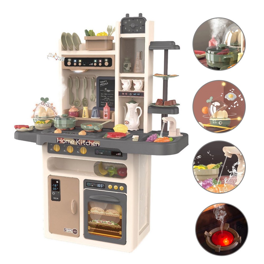 Bucataria este dotata cu efecte sonore realiste care imita sunetul de prajire si clocotire pentru fascinatia micutilor. Pentru a crea efectul de fierbere, arzatorul dispus in partea stanga poate fi umplut cu 50 ml de apa care va genera abur rece in timp ce micutul gateste cot la cot cu dumneavoastra. Pentru o atmosfera cat mai vesela, panoul muzical poate fi controlat de cel mic, iar cu ajutorul celor 65 de accesorii incluse jocul de rol va fi unul interactiv. Copiii vor descoperi fructele, legumele si alimente noi, isi vor dezvolta creativitatea, imaginatia, abilitatile sociale.