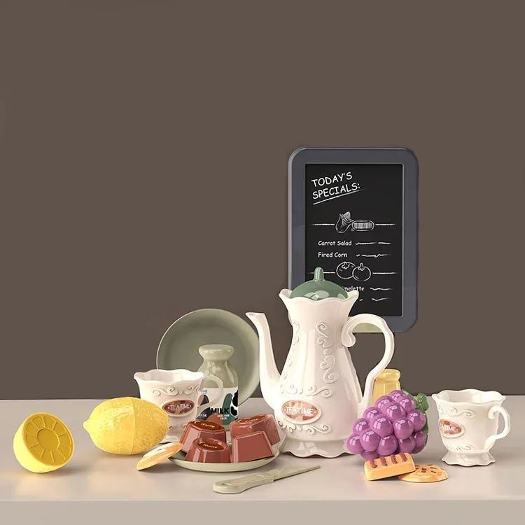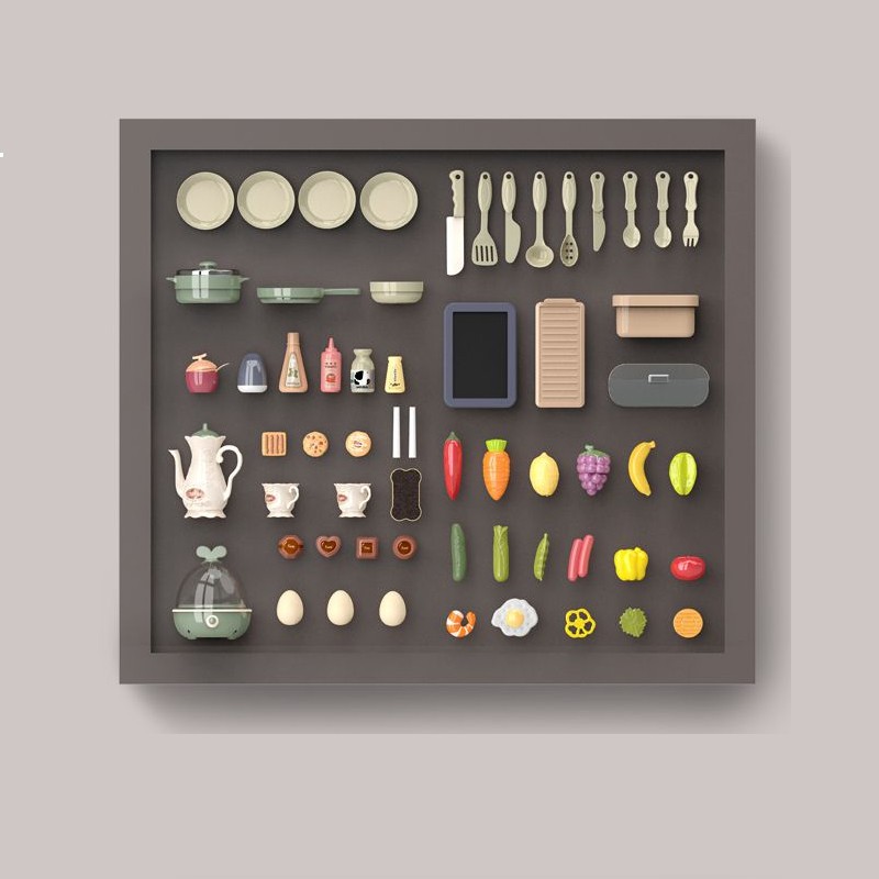 Pachetul include: tabla pentru scris, burete, 2 crete, 3 oua, oala cu capac, tigaie, bol, 2 cutite pentru tocat, 2 lingurite, furculita, cutit, lingura paste, spatula, polonic, ceainic si 2 cani, 4 farfurii, container, raft transparent detasabil, tocator, 3 fursecuri, 4 bomboane de ciocolata, ou ochi, 2 cremwursti, rosie, struguri, morcov, 2 carnati, ardei rosu, banana, castravete, frunza de salata verde, crevete, felie de ardei, varza chinezeasca, mazare, felie morcov, ardei galben, banana, castravete, lamaie, mustar, Ketchup, recipient sare si zahar cu capac si lingurita, lapte.