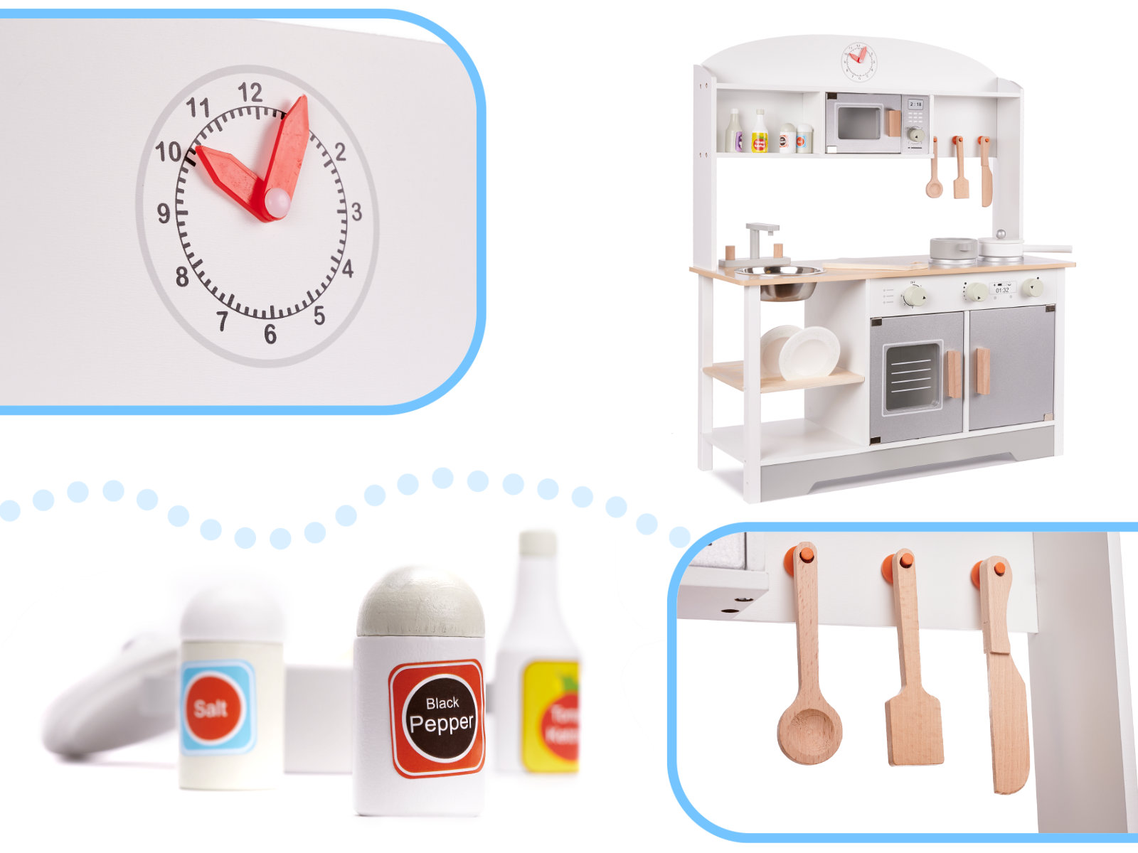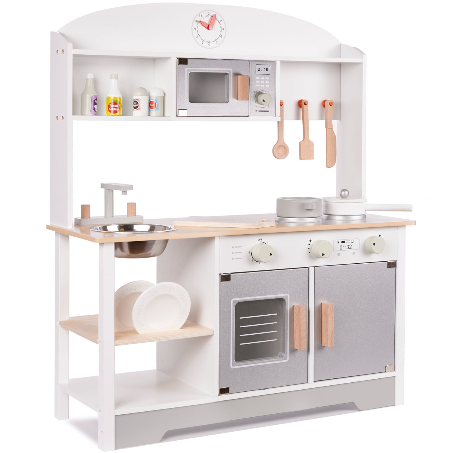 Această bucătărie de jucărie din lemn este prevăzută cu blat de lucru, chiuvetă cu robinet, plită cu butoane, cuptor cu geam, cuptor cu microunde, rafturi și suporturi pentru accesorii. Setul inclus face jocul mai realist și îi ajută pe copii să își dezvolte imaginația, coordonarea mână-ochi și abilitățile practice într-un mod plăcut și natural.