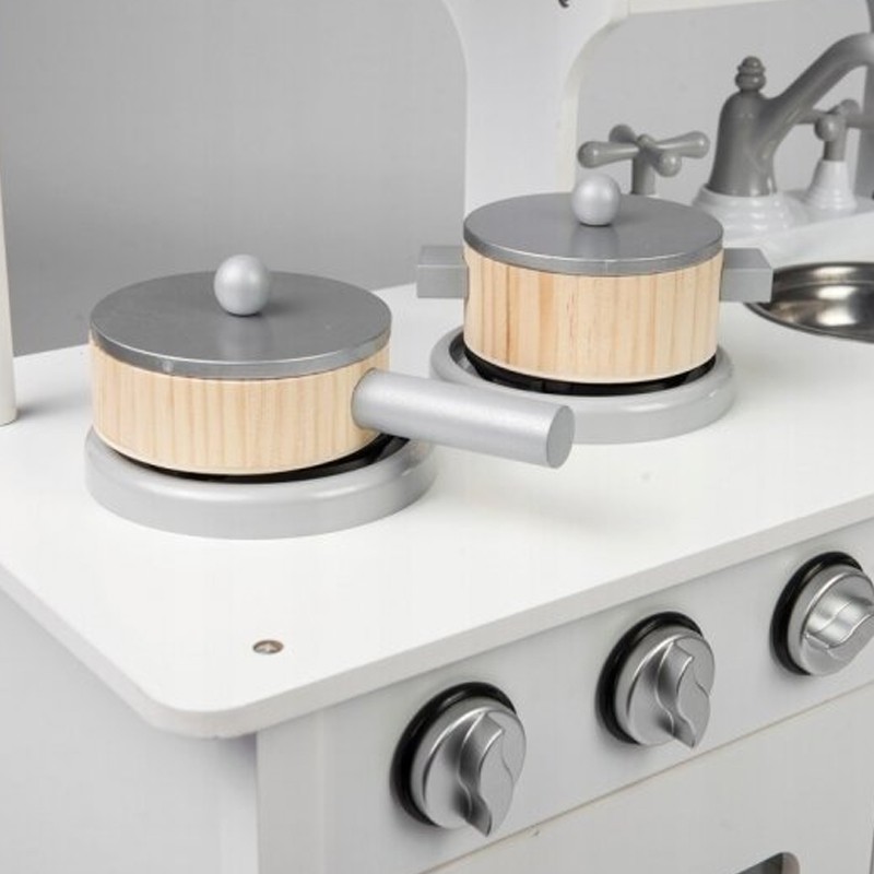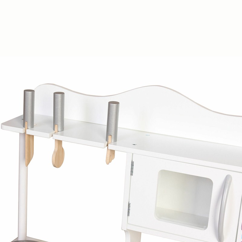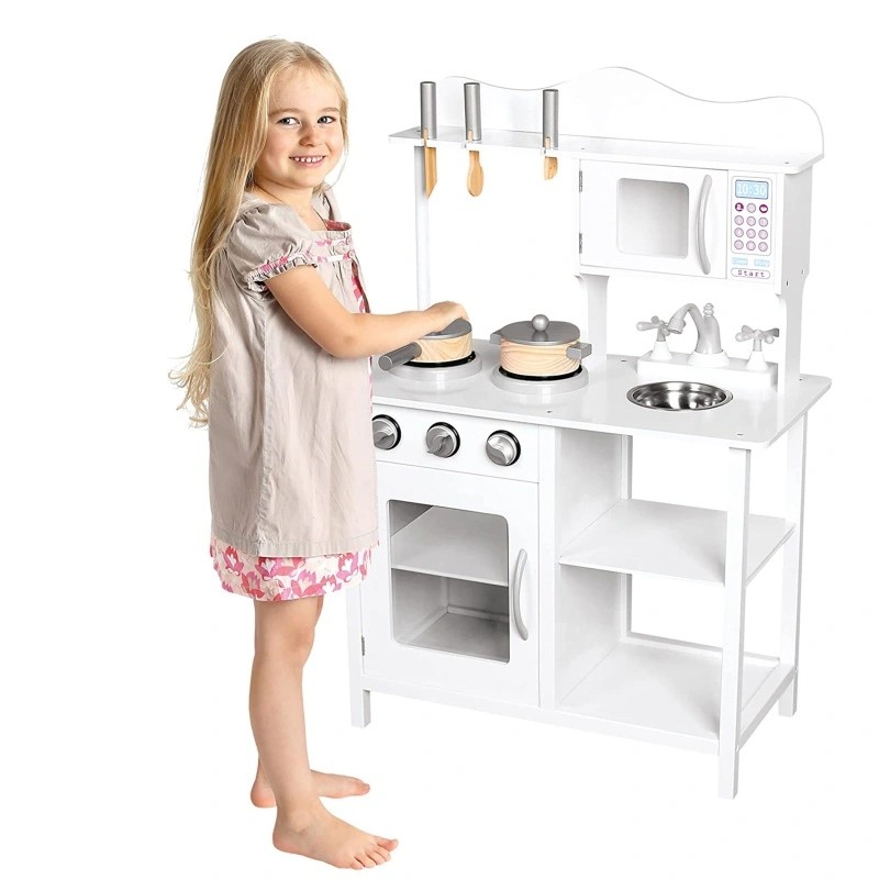 Setul include un cuptor cu microunde care se inchide si se deschide, permitand copiilor sa simuleze incalzirea mancarii, o chiuveta detasabila cu robinet care le ofera o experienta autentica de gatit si curatare, rafturi pentru depozitarea ustensilelor si accesoriilor de gatit, dar si 3 ustensile pentru gatit si 2 oale, dintre care una cu capac. Pe langa accesoriile de mai sus, bucataria dispune de 3 butoane pentru aragaz, 2 arzatoare, dulap si rafturi.