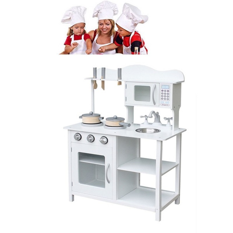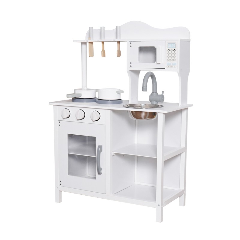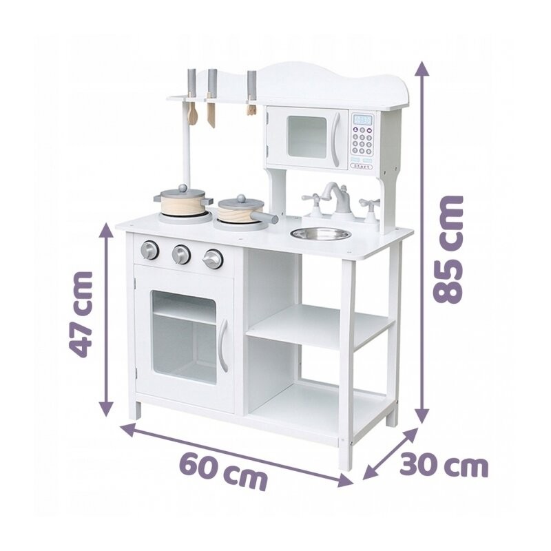 Bucatarie din lemn si mdf pentru copii, cuptor cu microunde, chiuveta, rafturi, ustentile pentru gatit, 60x30x85 cm, alba MultiMark GlobalProd