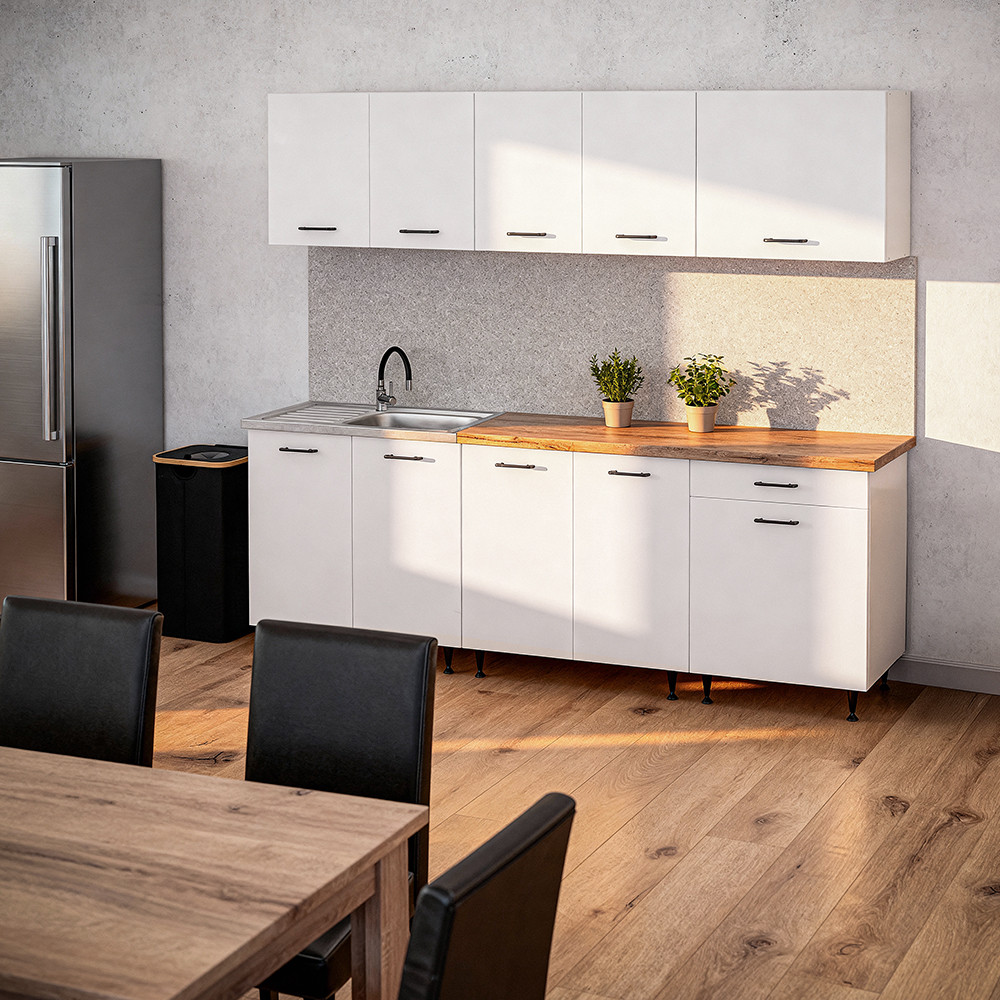 Transformă rapid bucătăria într-un spațiu ordonat și luminos cu setul bucătărie modulară Leziter Primo 220. Combinația dintre corpul alb și blatul cu aspect de stejar Charlestone oferă un look modern, ușor de integrat în apartamente și case din România, mai ales în bucătării mici și medii.