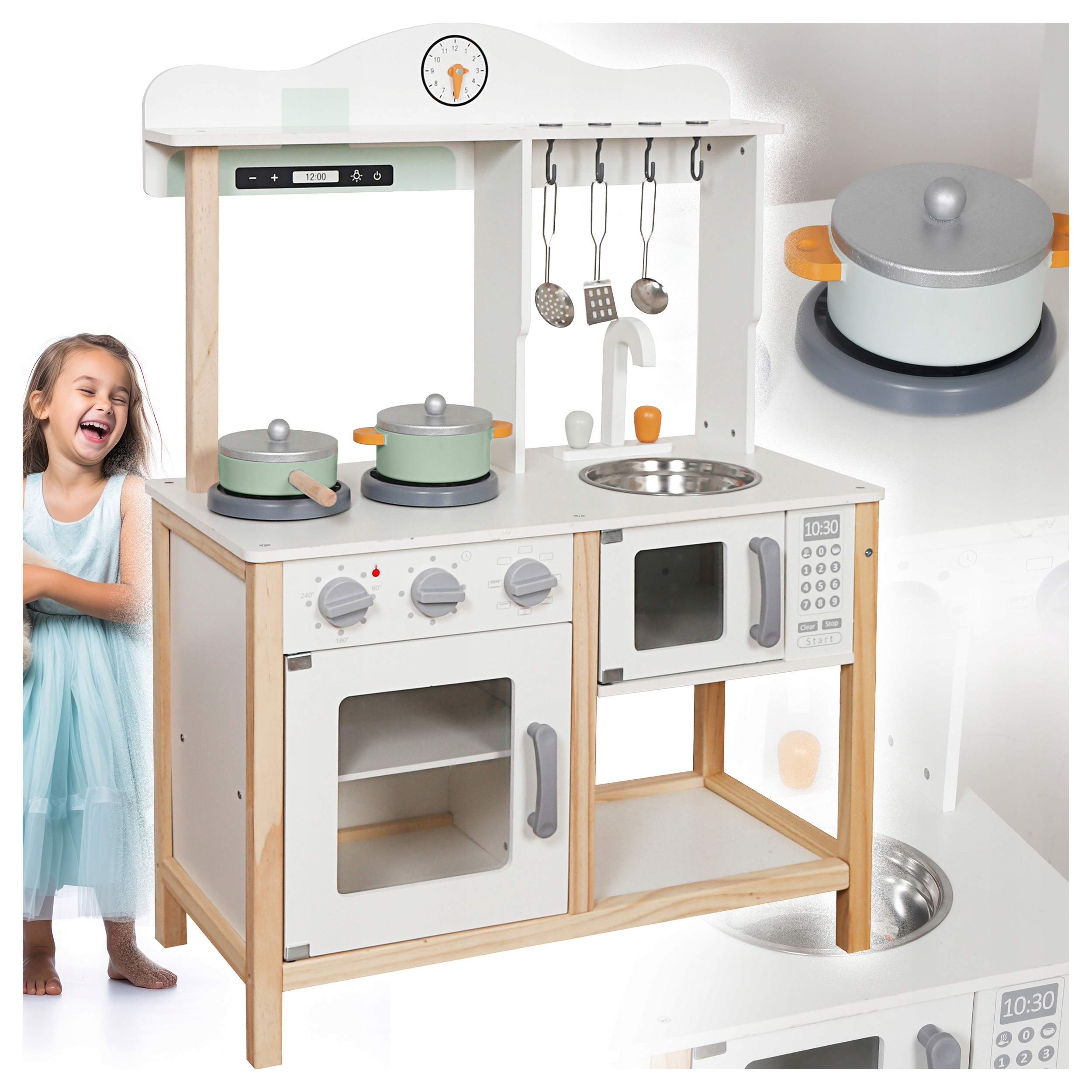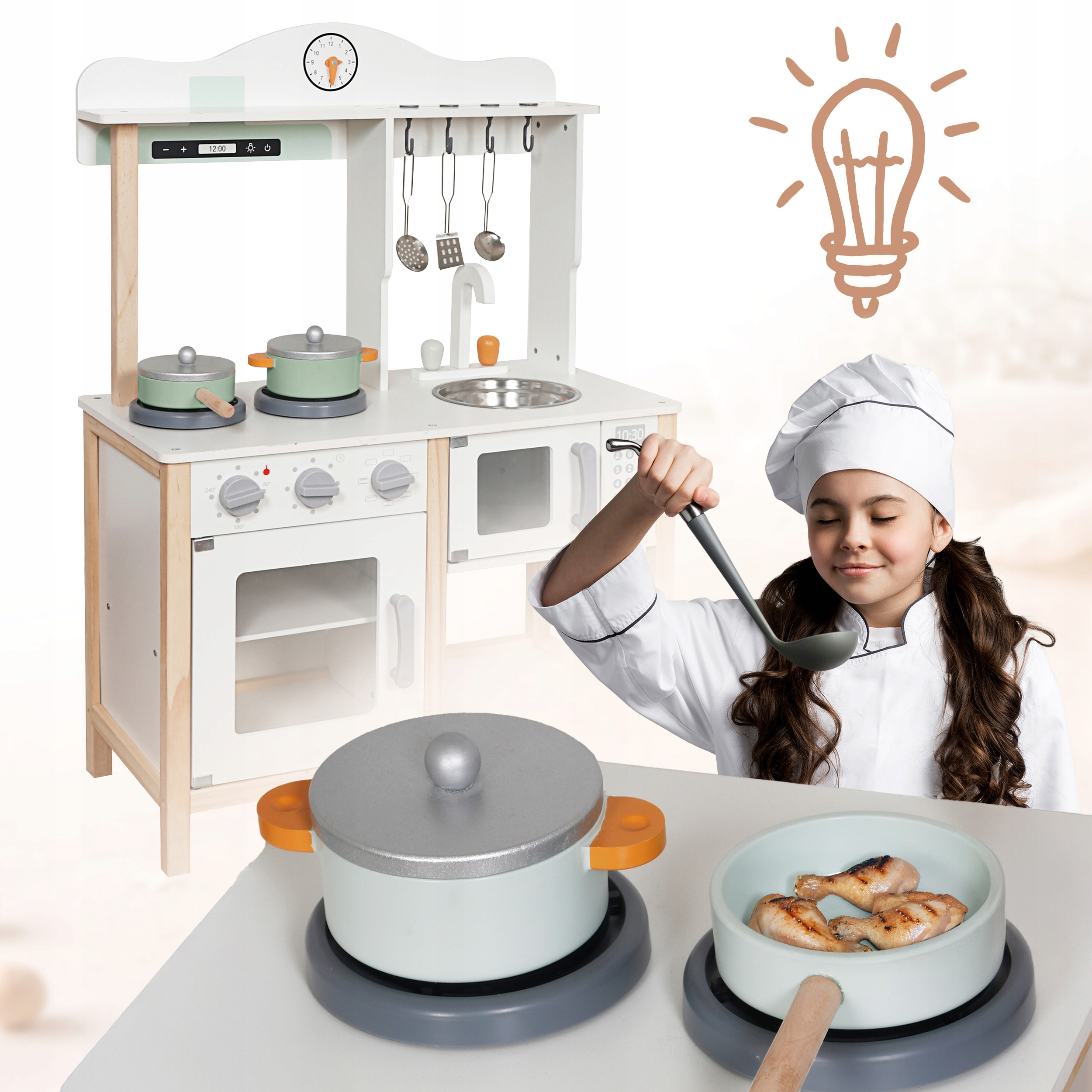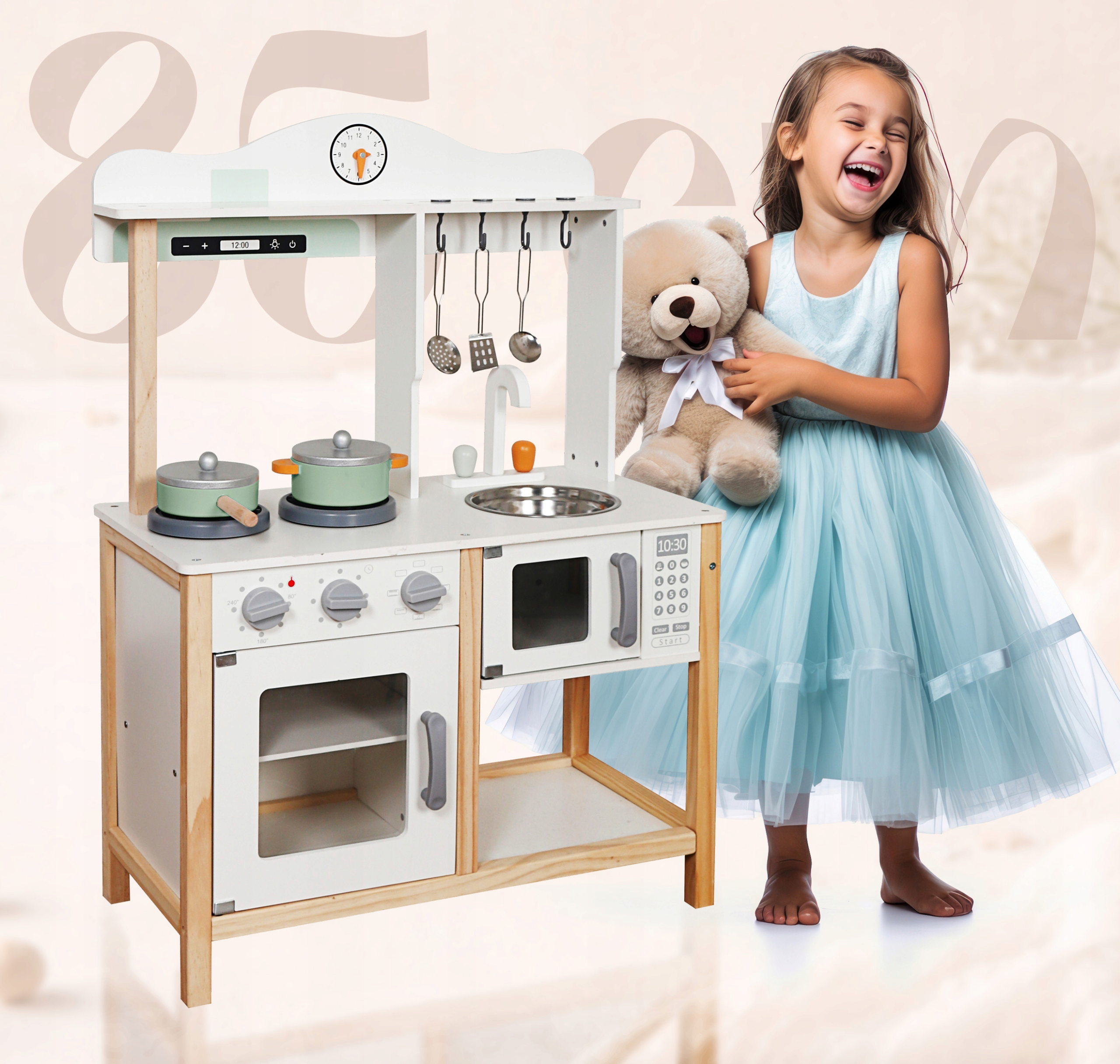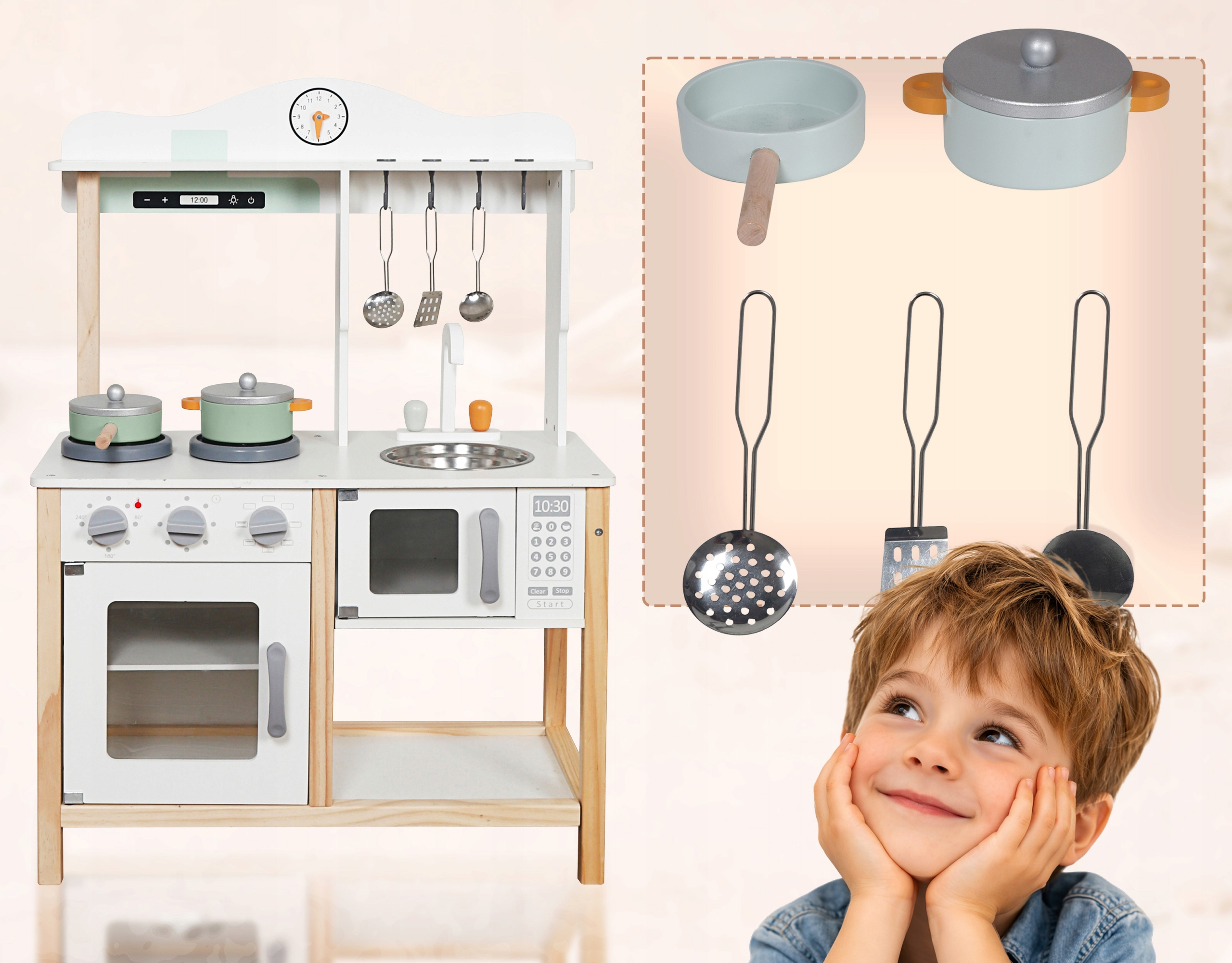 Specificatii tehnice Material: MDF + lemn masiv Culoare: multicolor Dimensiuni produs: 60 x 30 x 85 cm Dimensiuni ambalaj: 70 x 38 x 14 cm Functii: efecte sonore realiste Continut pachet: bucatarie de asamblat, 2 plite, cuptor, cuptor cu microunde, chiuveta metalica, robinet, lingura, paleta, lingura tip sita, oala, tigaie Scurta descriere Bucataria din lemn pentru copii este o jucarie interactiva si realista, ideala pentru micii pasionati de gatit. Dotata cu plite, cuptor, cuptor cu microunde, chiuveta si accesorii, permite recrearea activitatilor din viata de zi cu zi. Efectele sonore adauga un plus de realism, iar constructia solida asigura stabilitate si siguranta in utilizare. Potrivita pentru acasa sau gradinita, incurajeaza joaca de rol si creativitatea. Caracteristici principale Stimuleaza imaginatia si creativitatea Permite jocuri de rol realiste Include accesorii complete pentru gatit Prevazuta cu efecte sonore Dotata cu chiuveta si robinet Constructie solida si rezistenta Potrivita pentru acasa sau gradinita