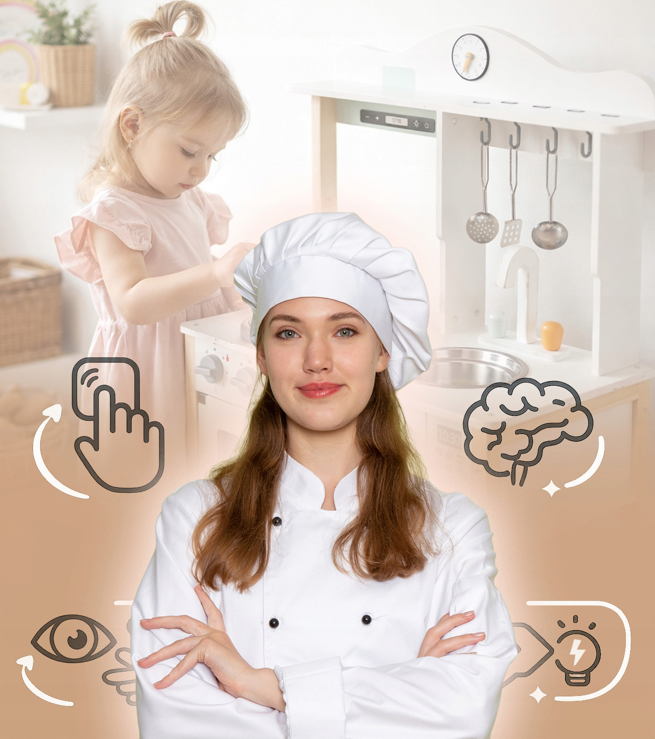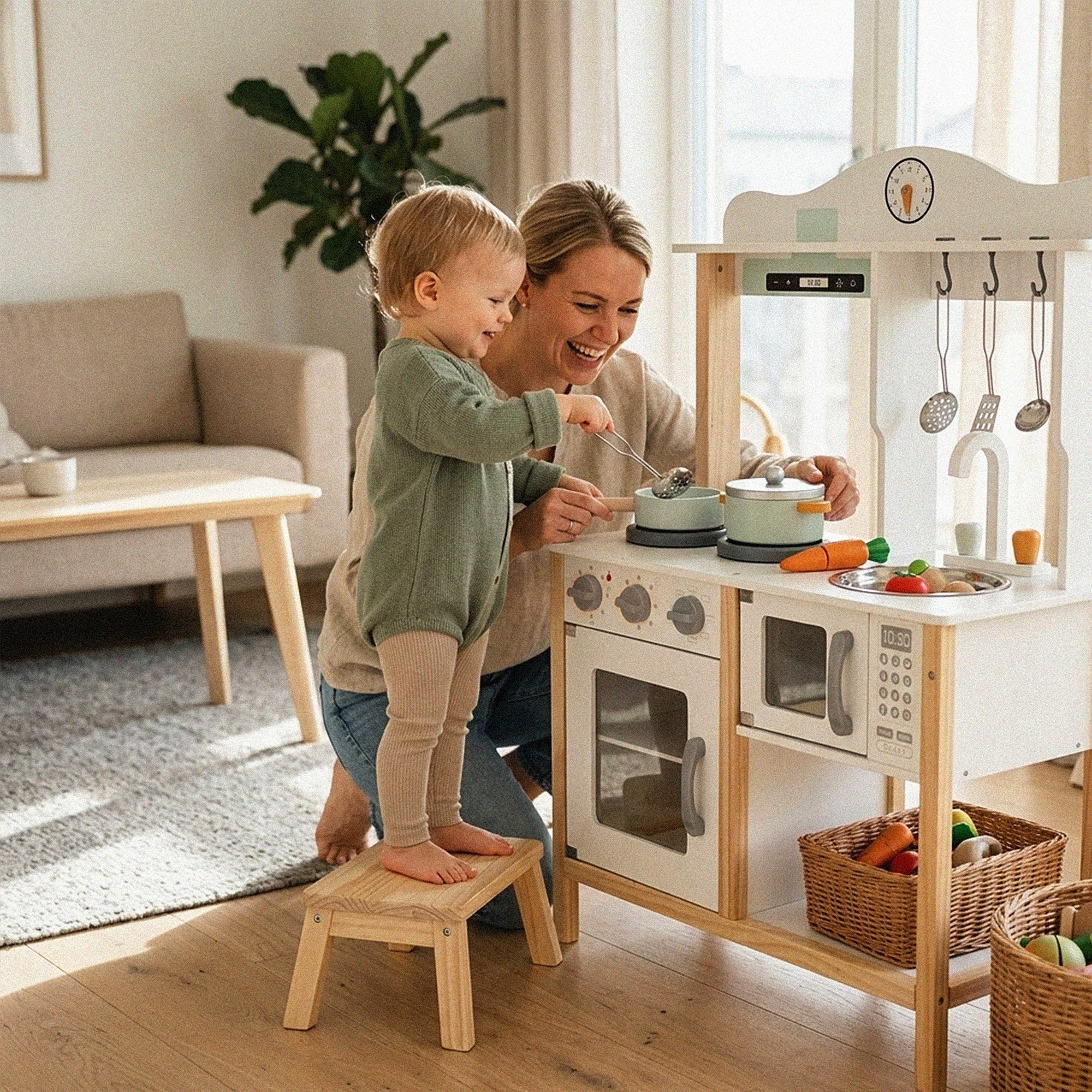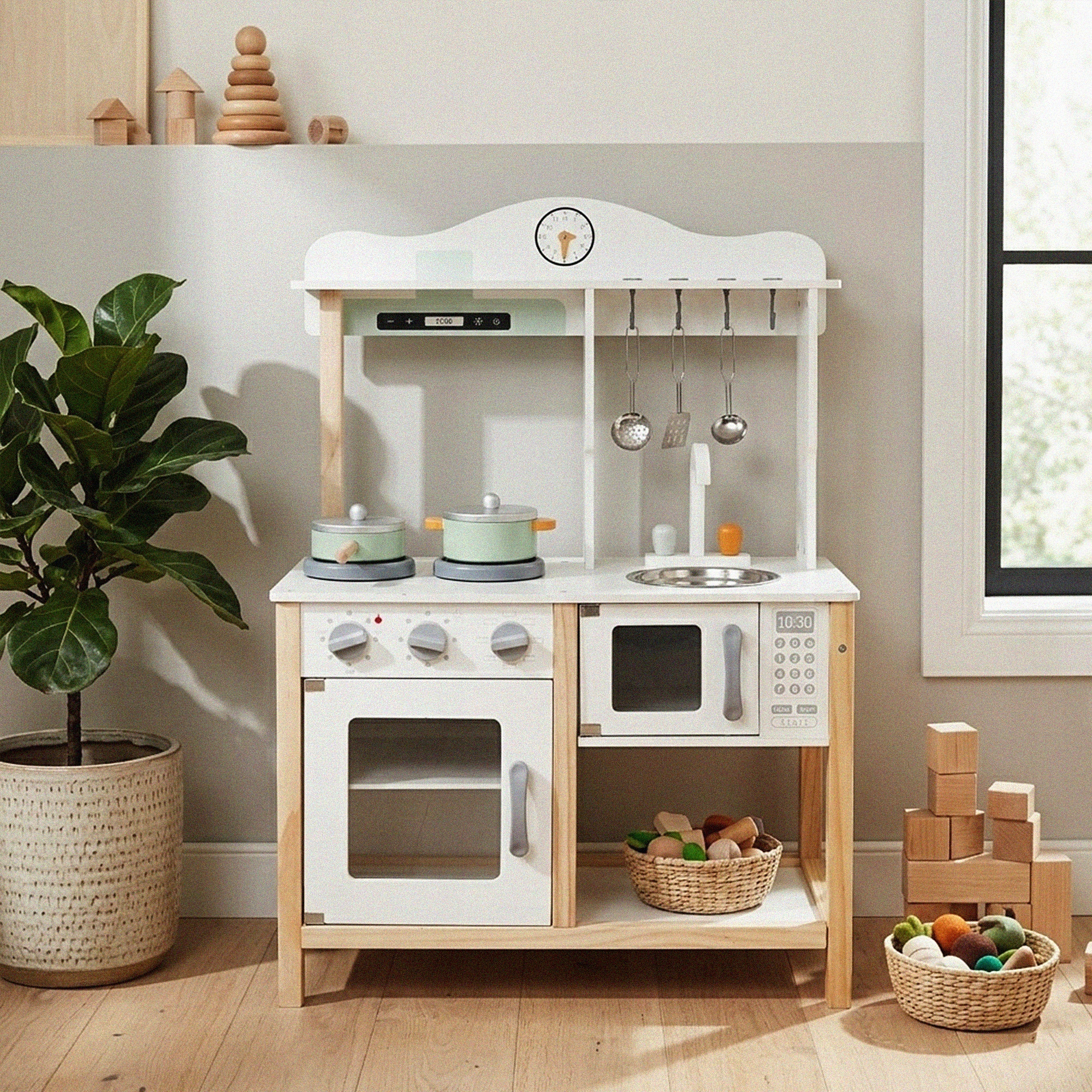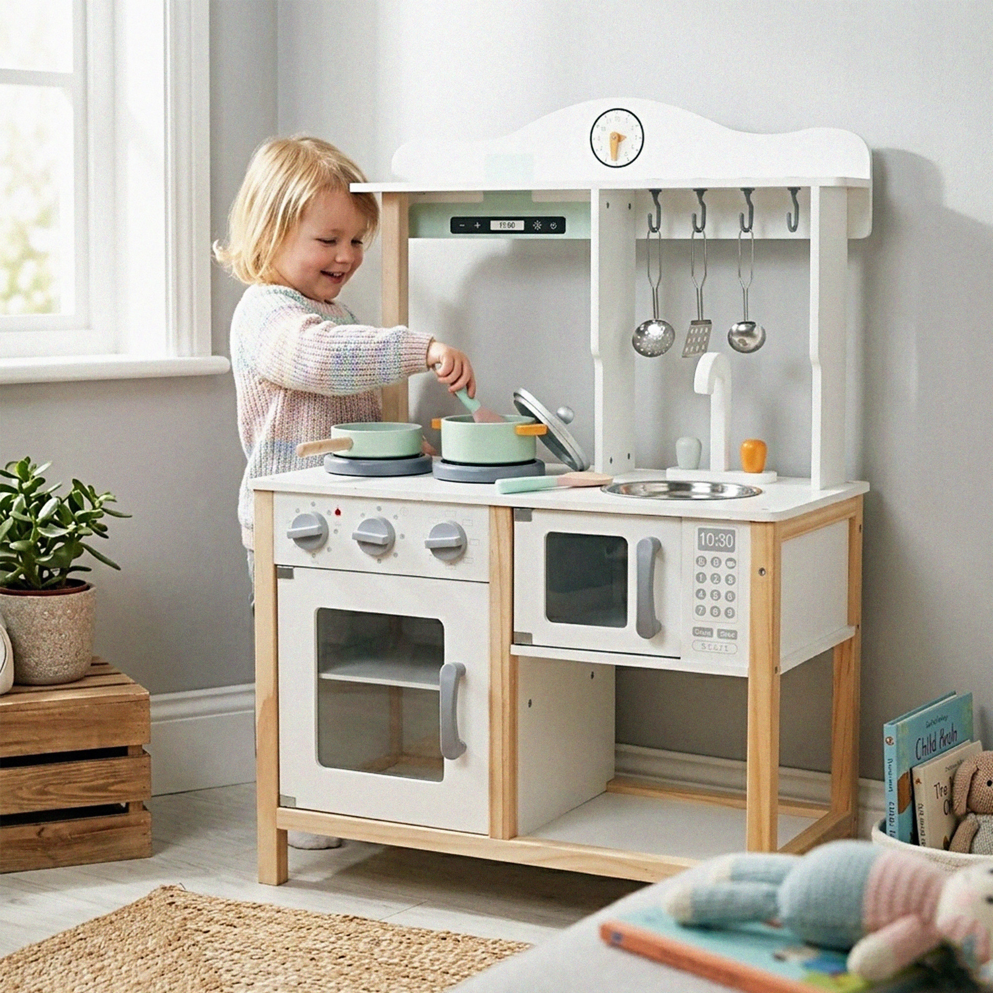 Specificatii tehnice Material: MDF + lemn masiv Culoare: multicolor Dimensiuni produs: 60 x 30 x 85 cm Dimensiuni ambalaj: 70 x 38 x 14 cm Functii: efecte sonore realiste Continut pachet: bucatarie de asamblat, 2 plite, cuptor, cuptor cu microunde, chiuveta metalica, robinet, lingura, paleta, lingura tip sita, oala, tigaie Scurta descriere Bucataria din lemn pentru copii este o jucarie interactiva si realista, ideala pentru micii pasionati de gatit. Dotata cu plite, cuptor, cuptor cu microunde, chiuveta si accesorii, permite recrearea activitatilor din viata de zi cu zi. Efectele sonore adauga un plus de realism, iar constructia solida asigura stabilitate si siguranta in utilizare. Potrivita pentru acasa sau gradinita, incurajeaza joaca de rol si creativitatea. Caracteristici principale Stimuleaza imaginatia si creativitatea Permite jocuri de rol realiste Include accesorii complete pentru gatit Prevazuta cu efecte sonore Dotata cu chiuveta si robinet Constructie solida si rezistenta Potrivita pentru acasa sau gradinita