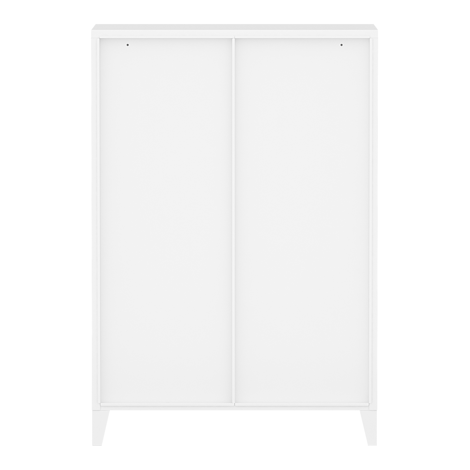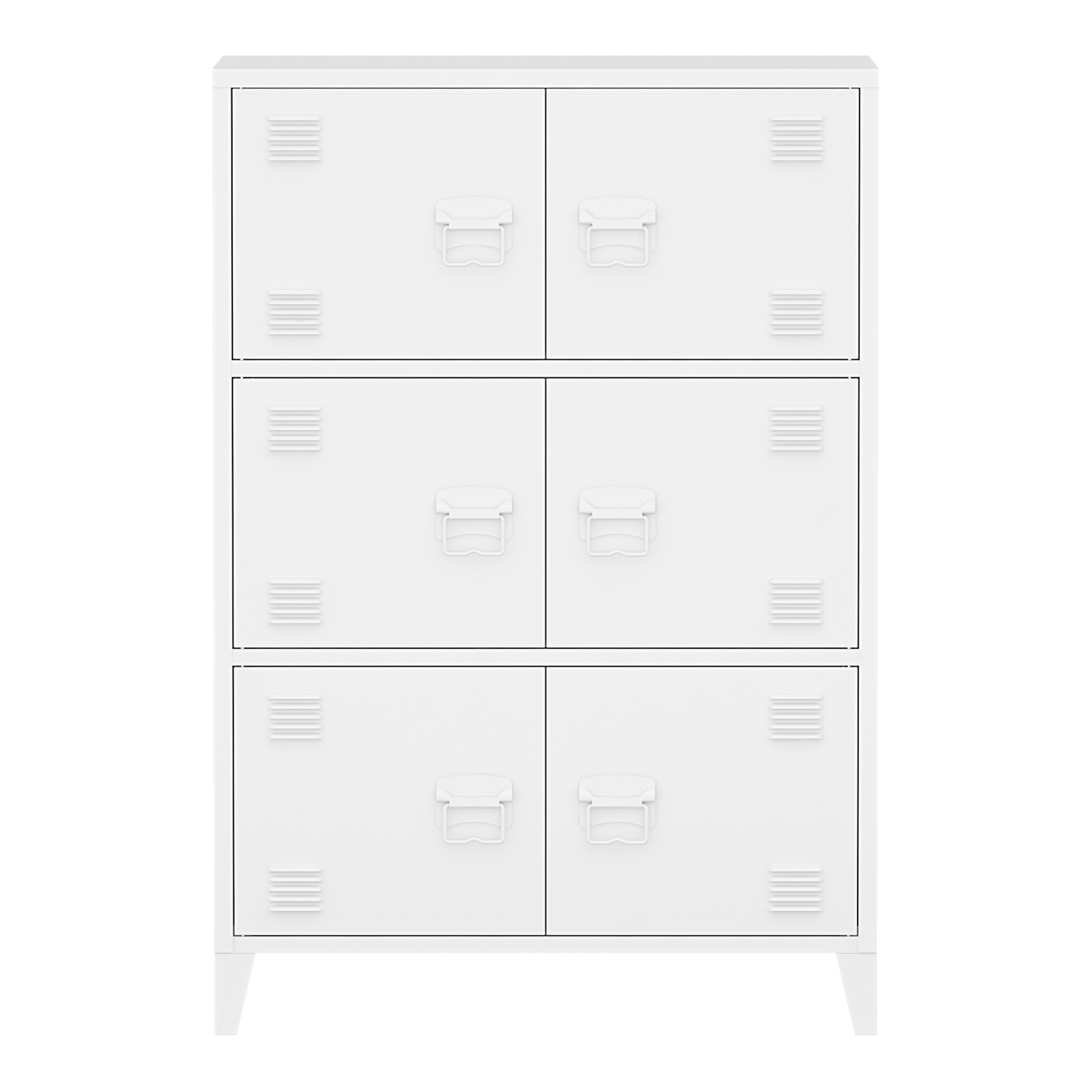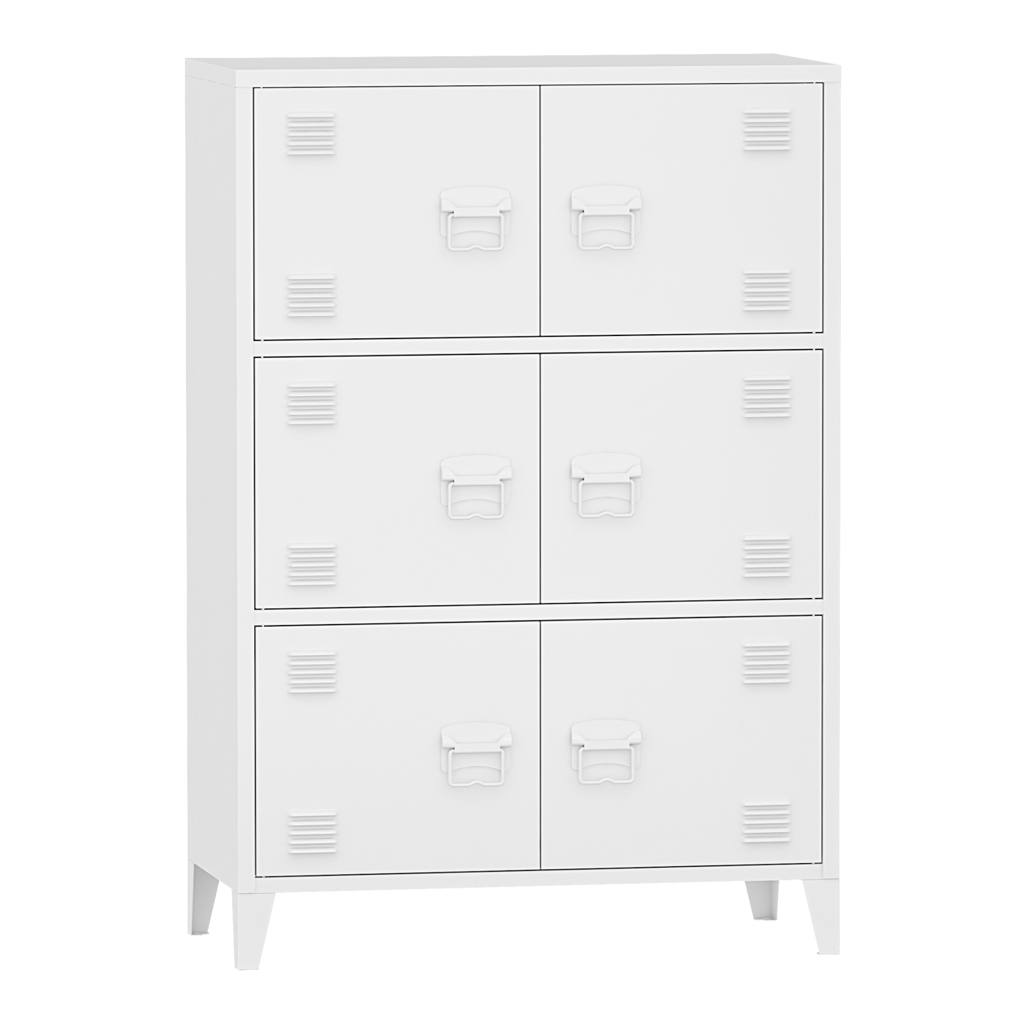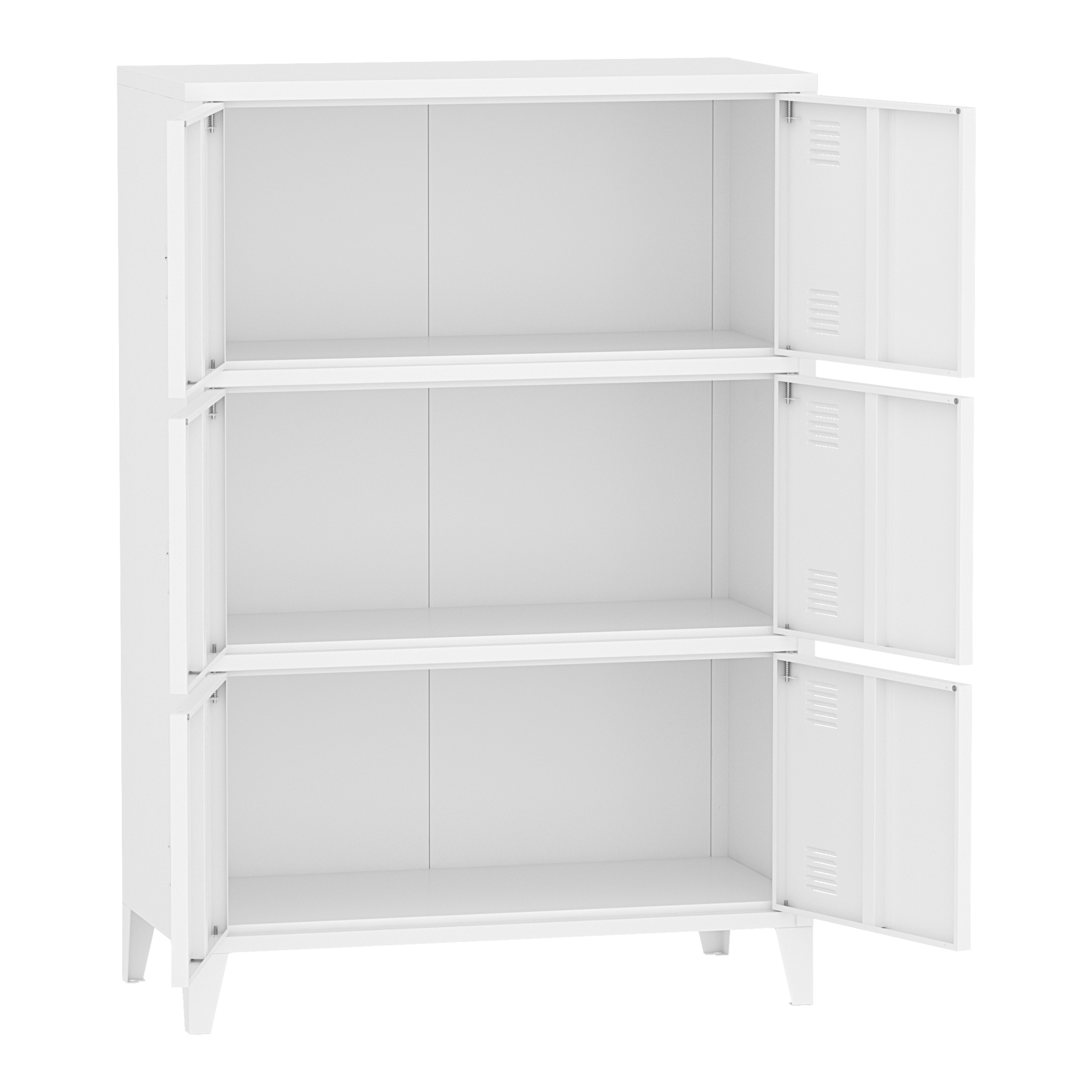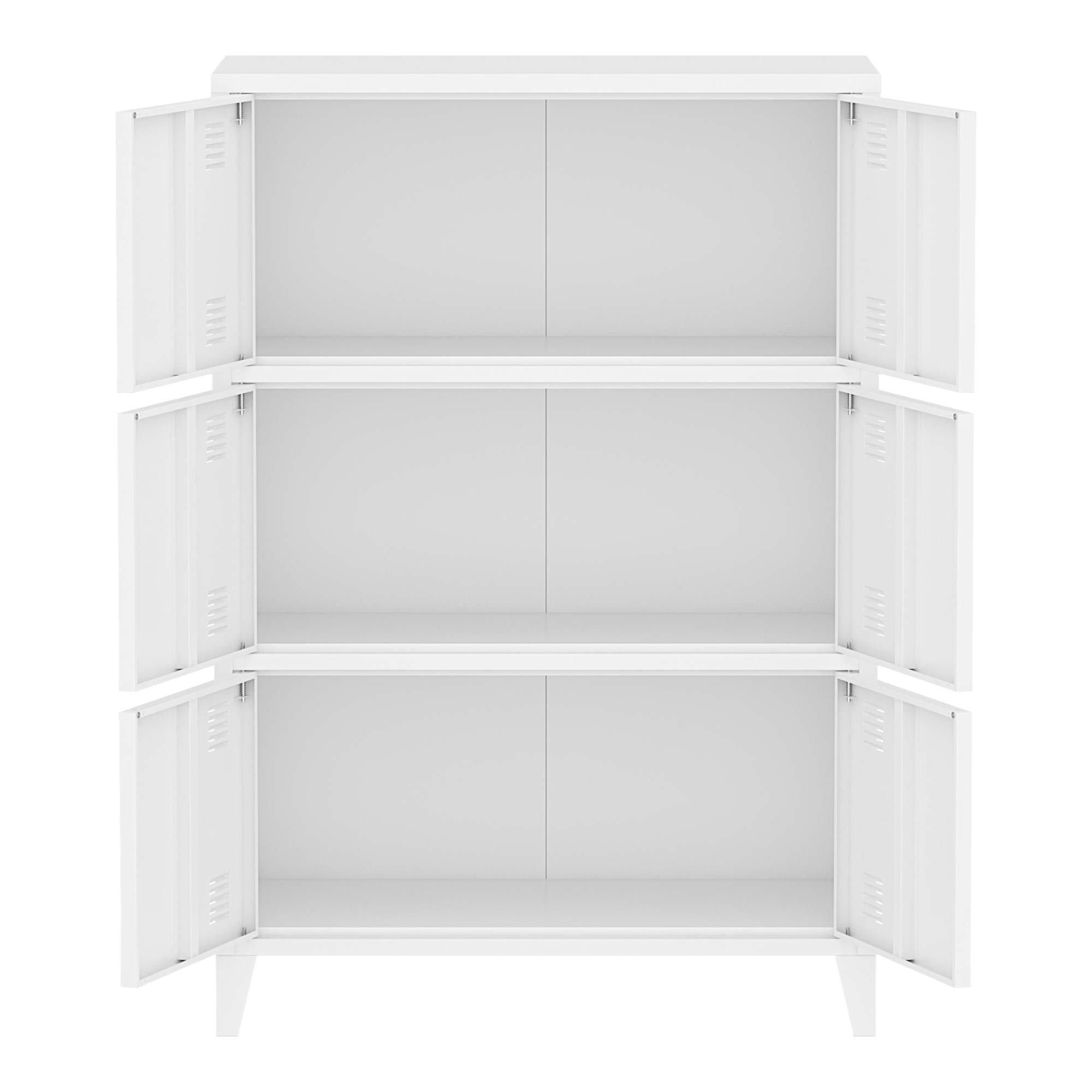 Mit insgesamt sechs Türen und drei Ablagefächern im Inneren bietet der Lagerschrank eine ausgezeichnete Möglichkeit, allerlei Gegenstände geordnet zu verstauen, sei es Bürobedarf, Werkzeuge oder Haushaltsutensilien.