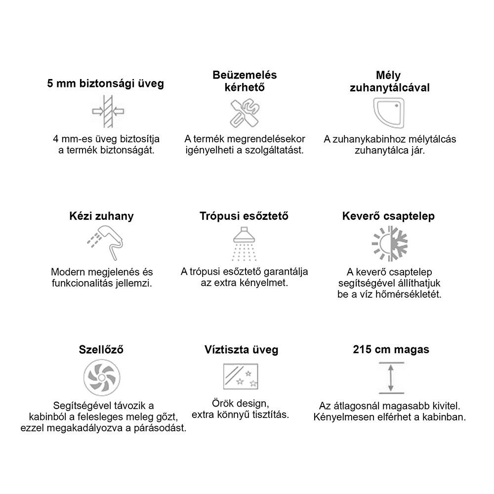 Pentru momente de relaxare, cabina este echipată cu 6 jeturi de hidromasaj, plus duș superior tip ploaie tropicală și duș de mână, ușor de comutat din selector. Tava adâncă îți oferă un plus de versatilitate și confort în utilizare.