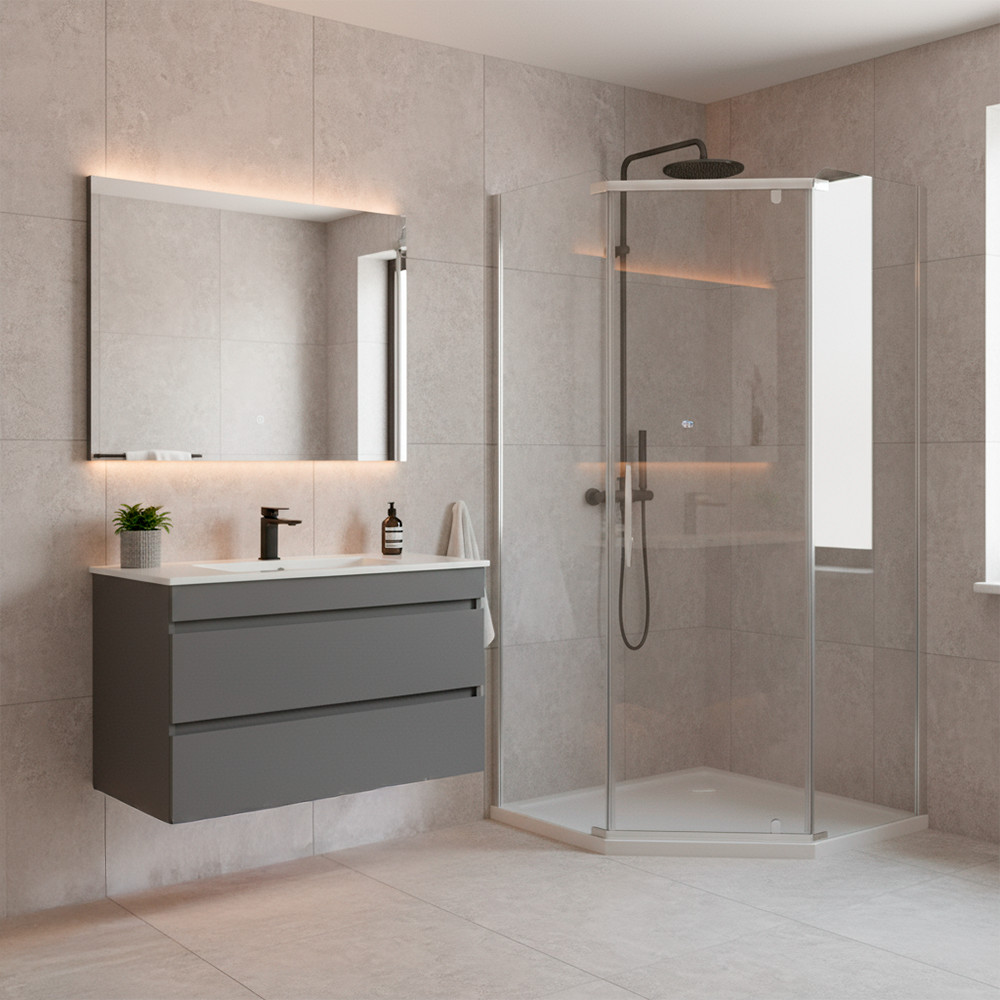 Bucură-te de un duș confortabil și un look modern în baie cu cabina de duș Leziter Celtic 90x90, cu formă pentagonală (tip diamant) și tavă de duș slim. Sticla transparentă păstrează spațiul luminos, iar designul pe colț ajută la economisirea spațiului în băile mici și medii.