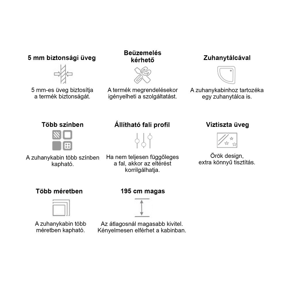 Utilizare: recomandată pentru băi de apartament sau casă, în special acolo unde ai nevoie de o cabină compactă, stabilă și ușor de curățat. Se montează pe pardoseală, folosind cadita inclusă, și se conectează la instalația standard de apă.