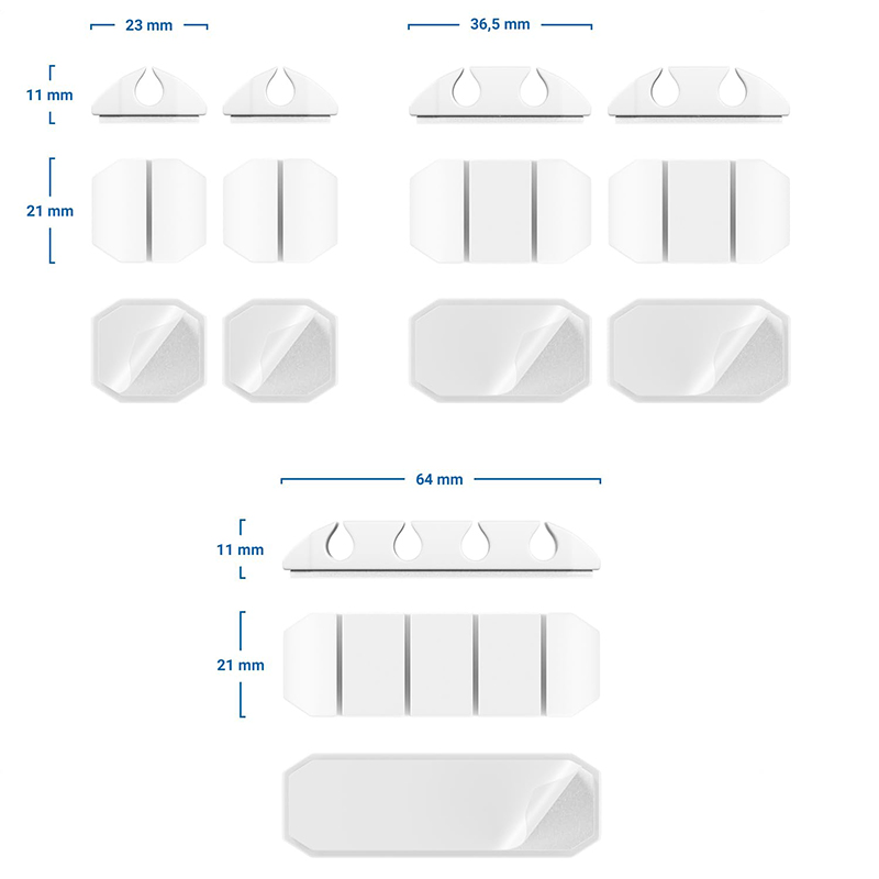 Acest produs facilitează organizarea, organizarea și fixarea cablurilor. Instalarea este rapidă, fără instrumente, datorită suportului autoadeziv care aderă fiabil