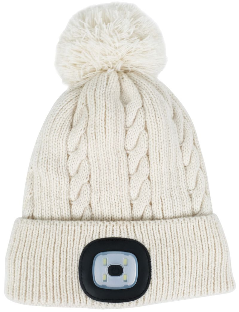 Căciulă de iarnă albă Strend Pro Damon, mărimea L, cu ciucure și LED integrat de 60 lm. Oferă confort termic și iluminare practică pentru plimbări sau activități outdoor. Are 3 trepte de lumină, încărcare USB și design modern, ușor de asortat în sezonul rece.