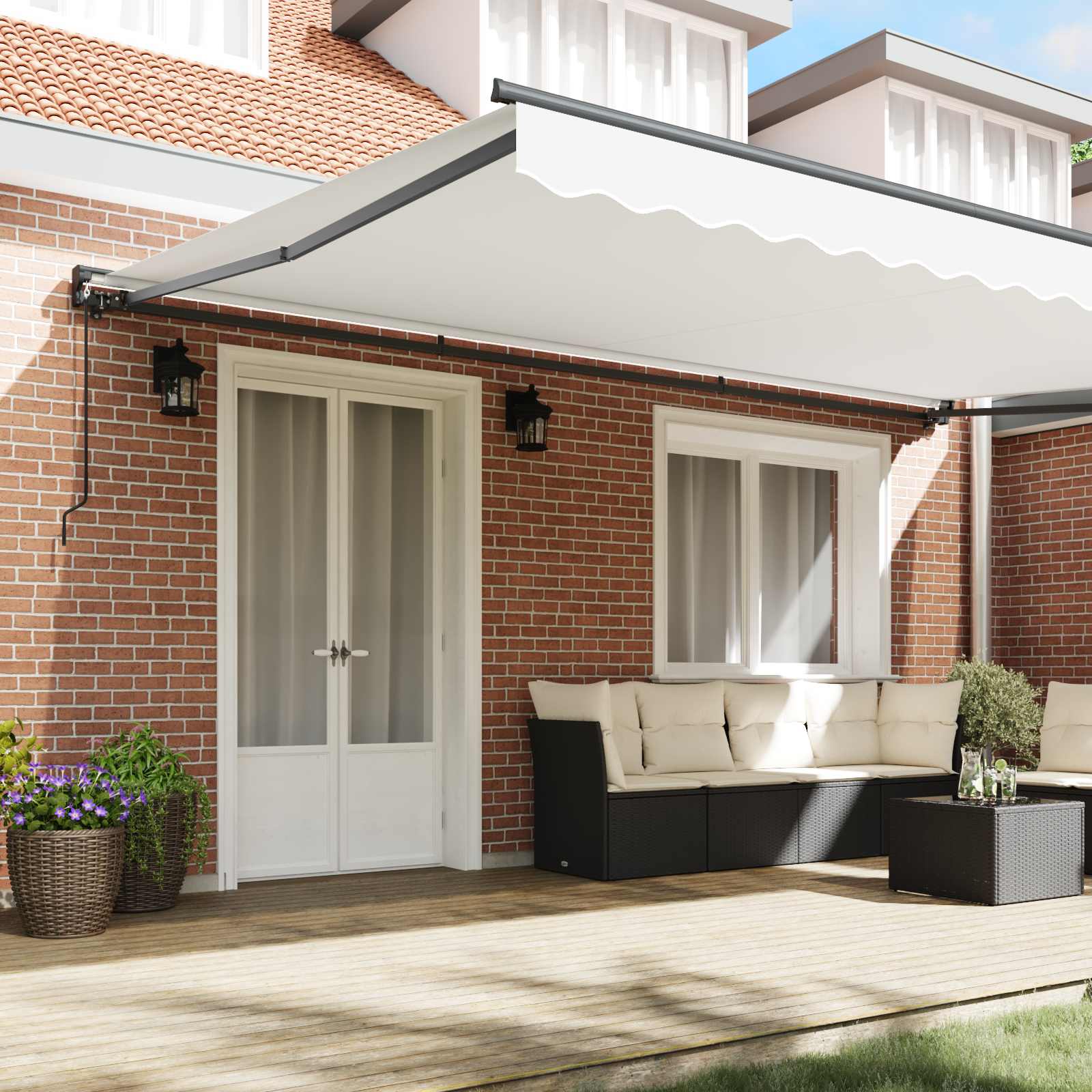 Această marchiză retractabilă îți oferă o umbră practică pentru spațiile exterioare, cum ar fi grădinile și terasele. O poți extinde sau retracta ușor ca să ajustezi câtă lumină și protecție ai nevoie. E perfectă pentru activități ca servirea mesei afară, relaxarea sau primirea musafirilor, ajutând la crearea unui mediu mai confortabil, protejând de soare și de ploaia ușoară. Această marchiză e o adăugare faină pentru a profita la maximum de spațiile exterioare pe tot parcursul anului.