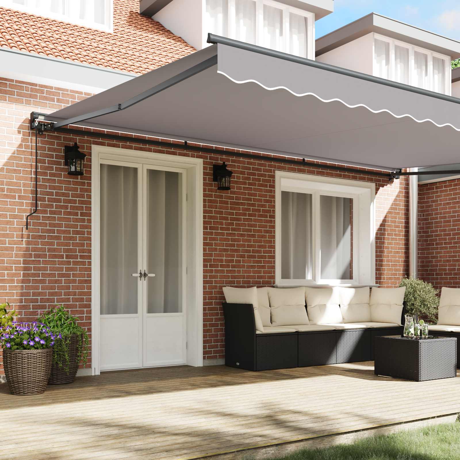 Această marchiză retractabilă îți oferă o umbră practică pentru spațiile exterioare, cum ar fi grădinile și terasele. O poți extinde sau retracta ușor ca să ajustezi câtă lumină și protecție ai nevoie. E perfectă pentru activități ca servirea mesei afară, relaxarea sau primirea musafirilor, ajutând la crearea unui mediu mai confortabil, protejând de soare și de ploaia ușoară. Această marchiză e o adăugare faină pentru a profita la maximum de spațiile exterioare pe tot parcursul anului.