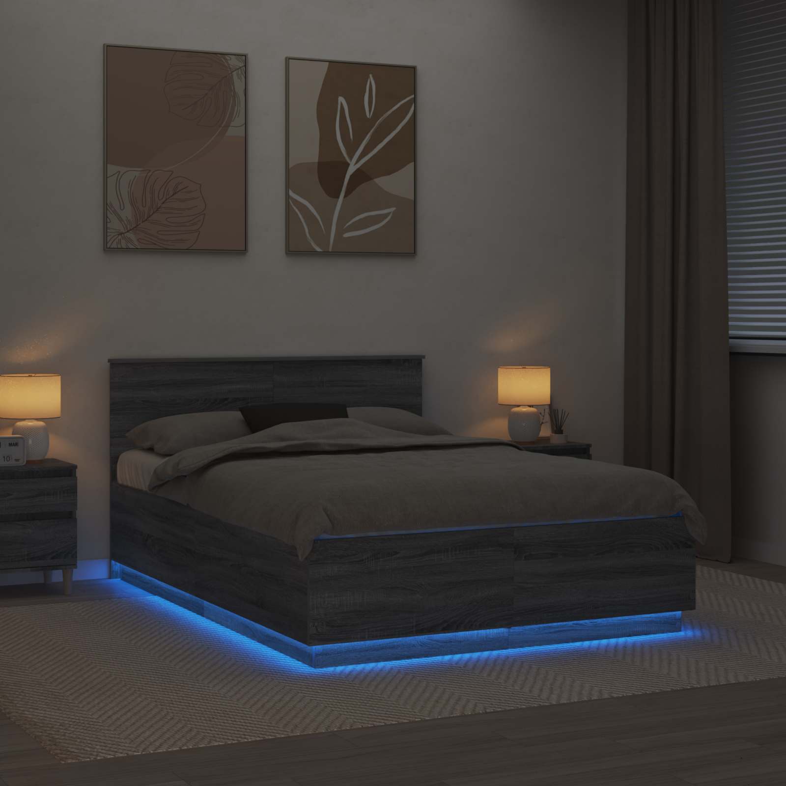 - Materiale: Cadru din lemn prelucrat de calitate superioară, rezistent și care nu se deformează. Materialul ăsta asigură un aspect constant și îmbunătățește designul dormitorului tău, oferind în același timp stabilitate și durabilitate.