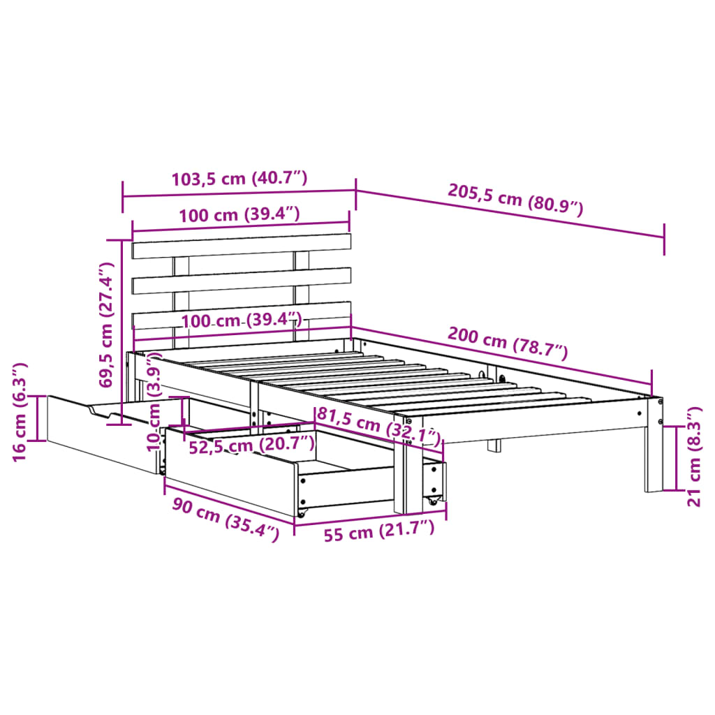 Cadru Pat cu Sertare 100x200 cm Lemn Masiv Pin GartenMobel Dekor