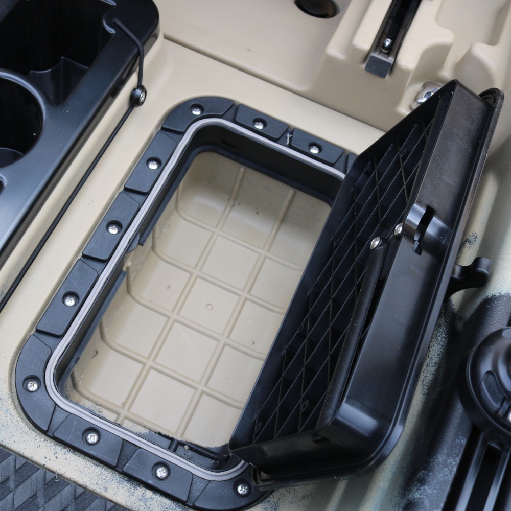 Datorita constructiei ingenioase din doua piese, il poti pune usor in masina sau depozita in pivnita. Scaunul este confortabil si se poate plia sau scoate complet — in functie de cat spatiu vrei pentru echipamente. Dispune de mai multe compartimente de depozitare impermeabile — in fata, in spate si doua cutii in mijloc — unde poti pune de la gustari pana la echipamente nautice serioase sau chiar peste viu. Datorita protectiei UV, soarele poate straluci cat vrea — materialul rezista si nu crapa.