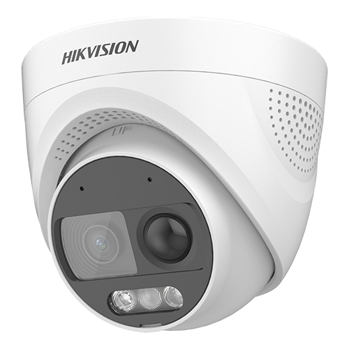 Camera de supraveghere video Analog HD ColorVu - Hikvision, echipata cu senzor PIR, sirena si stroboscop rosu/albastru, microfon de inalta fidelitate si speaker incorporat, 1 x iesire de alarma OUT, imagine Color 24/7 , rezolutie 2MP (1980x1080)@25fps, lentila 2.8mm, unghi vizualizare 98°, distanta lumina alba pe timp de noapte pana la 20 metri, semnal iesire TVI/CVI/AHD/Analog selectabil din dipswitch.