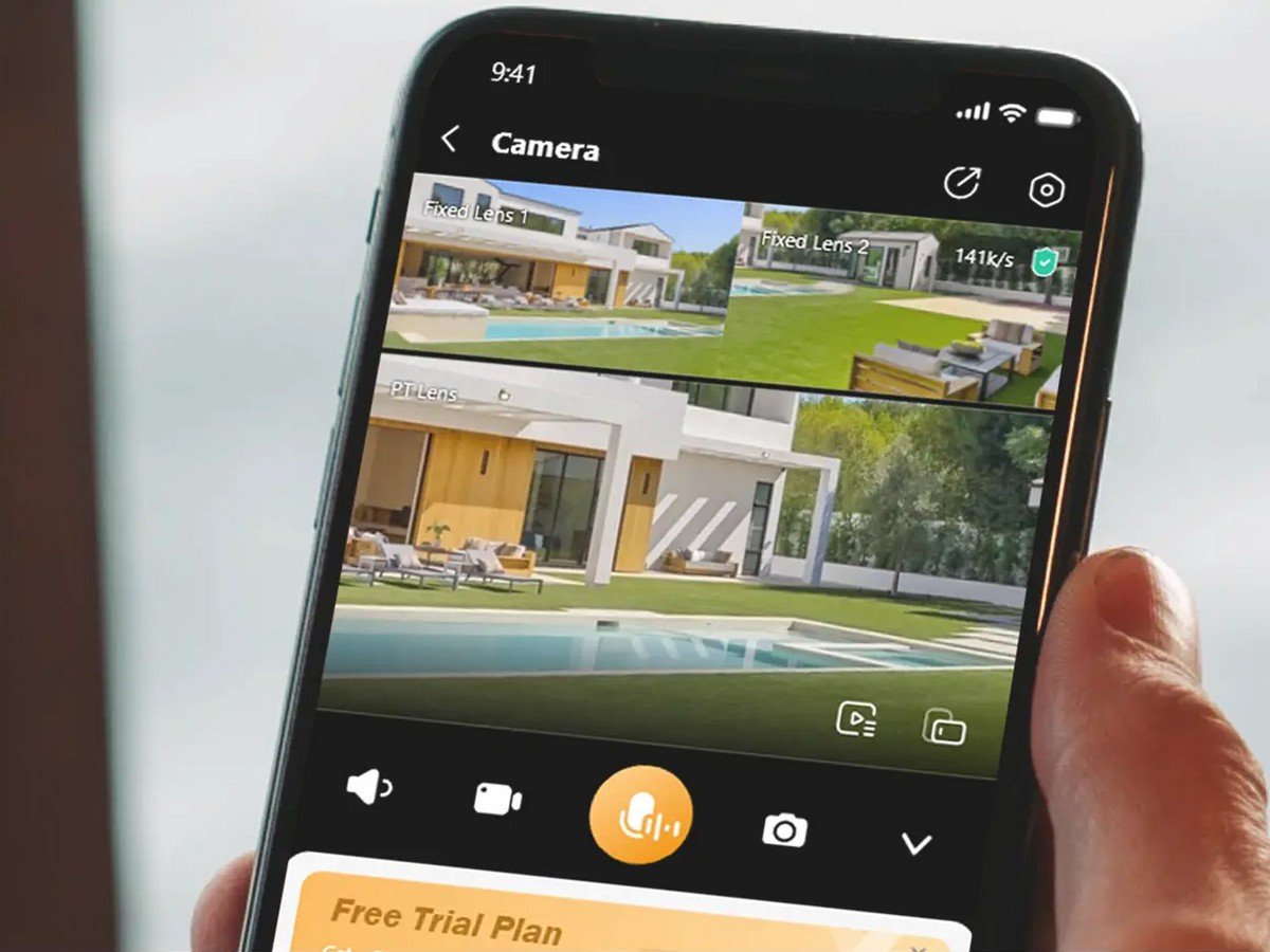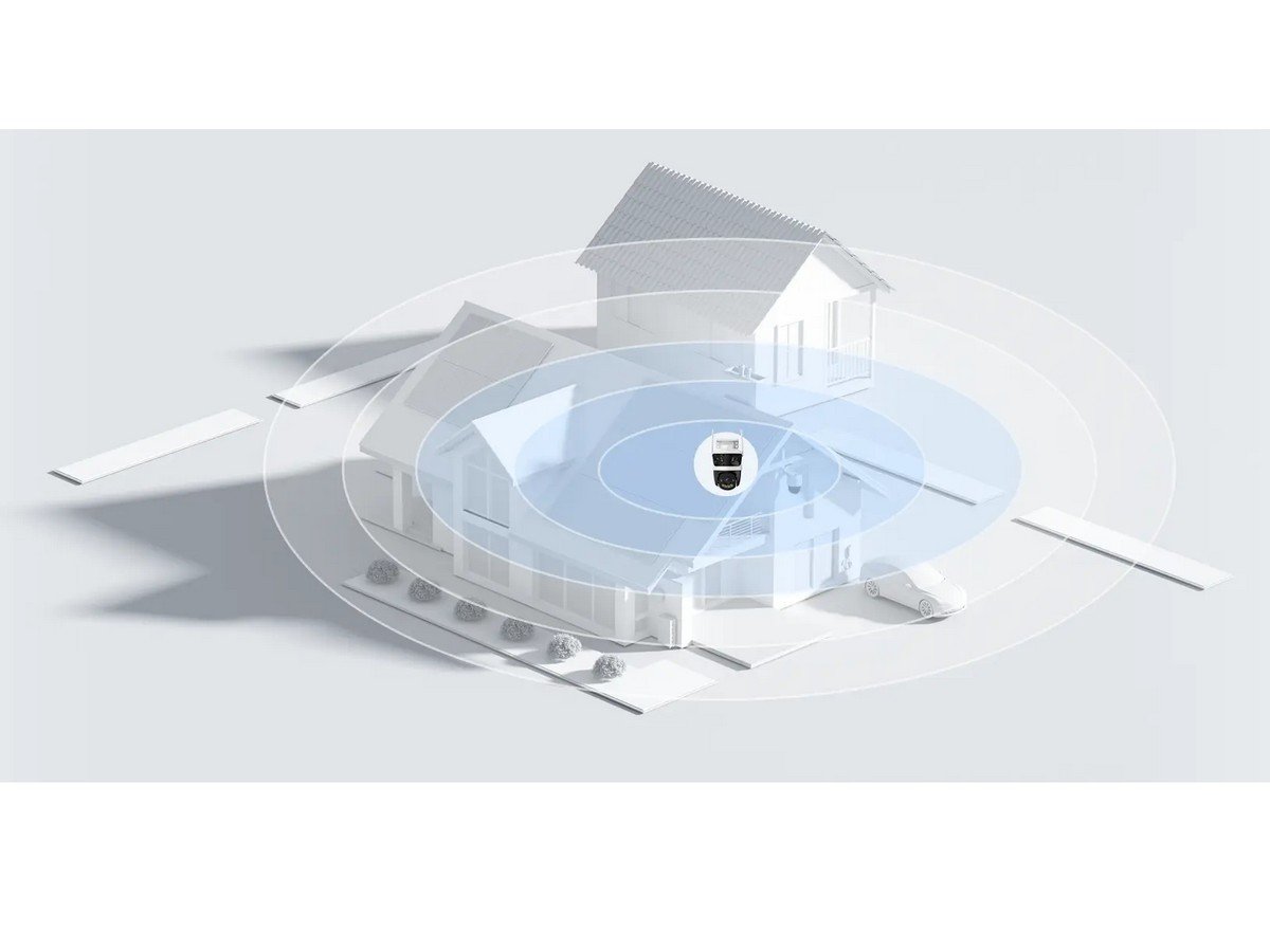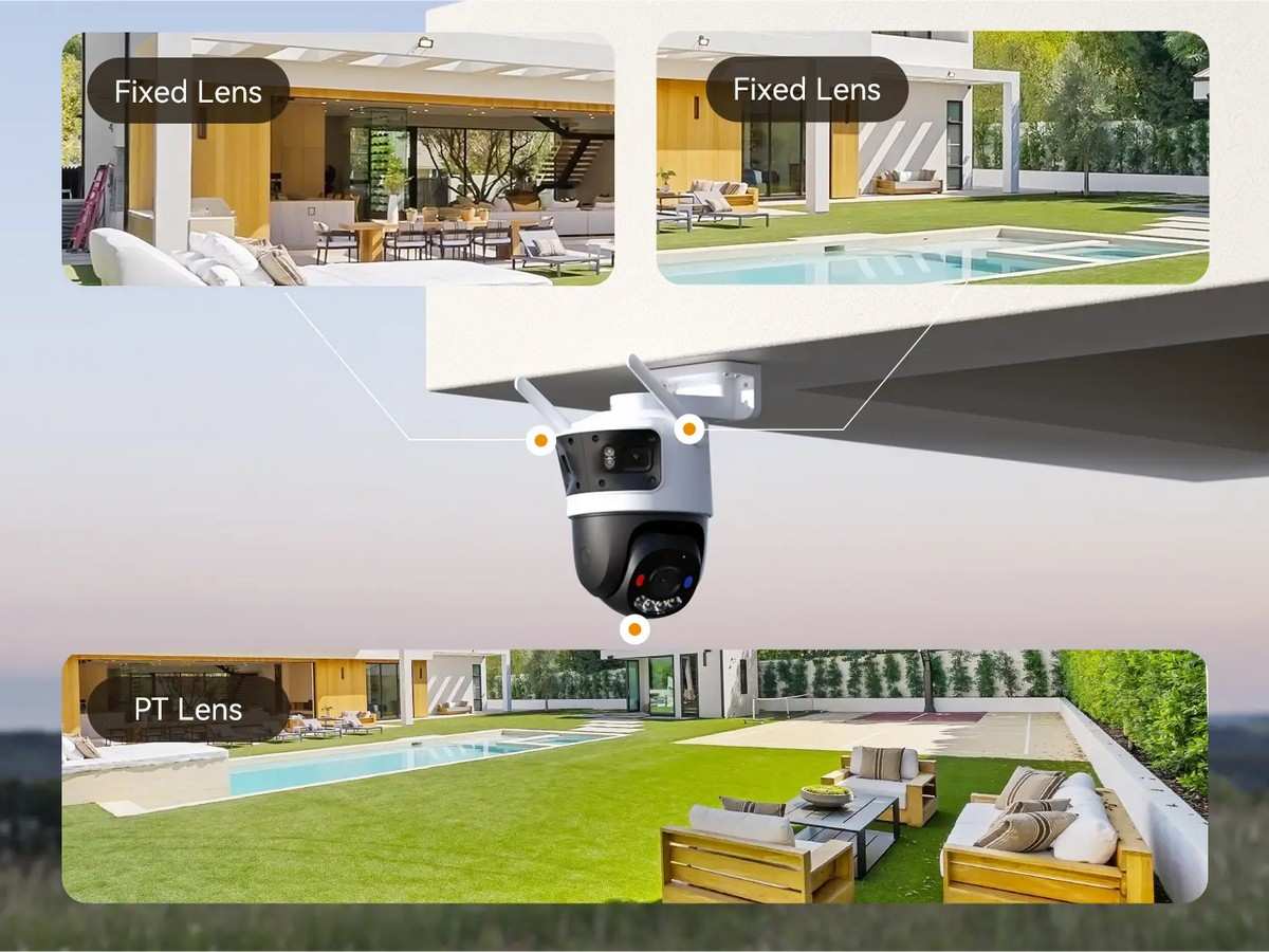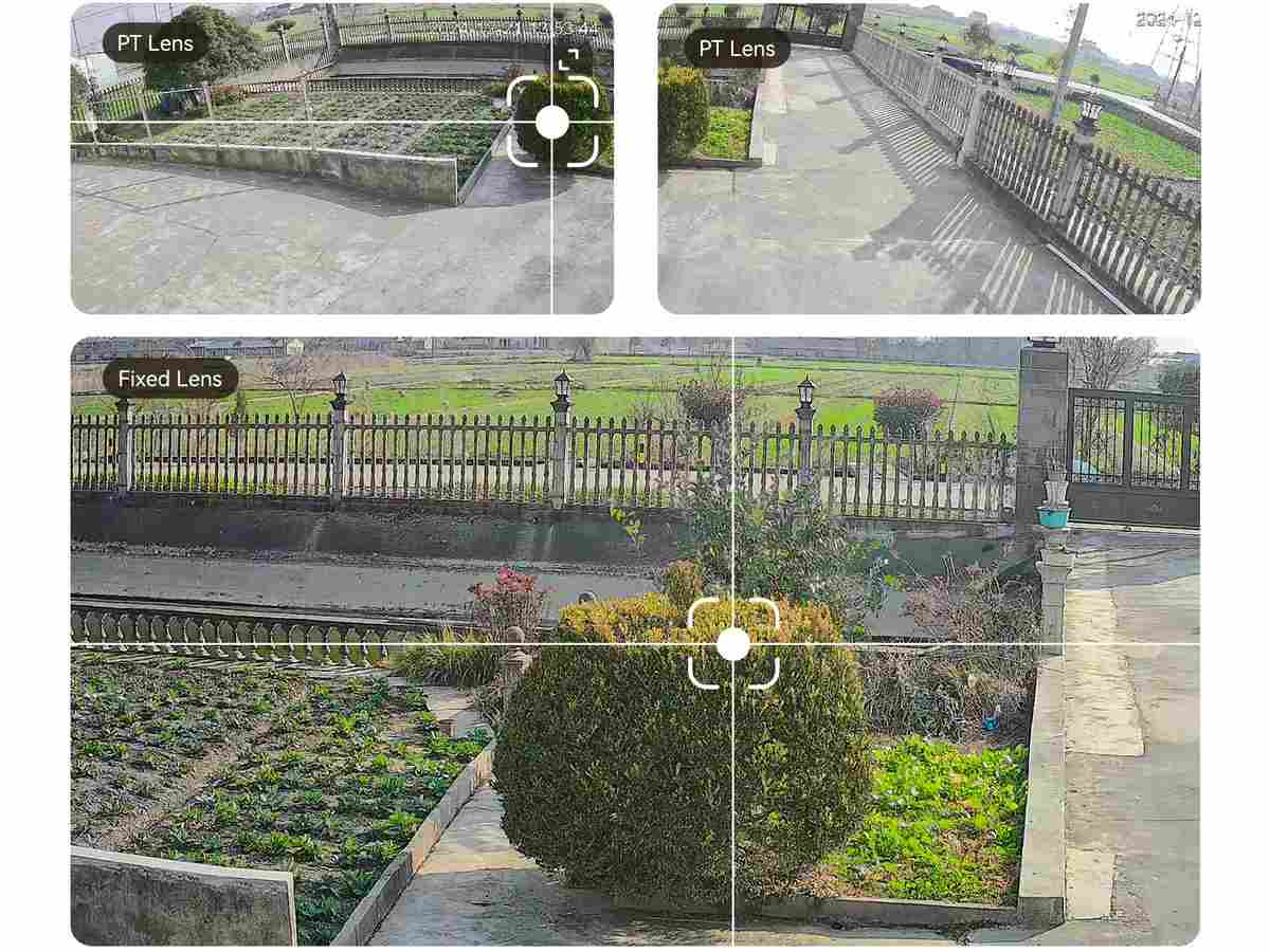 Camera este echipata cu doua lentile fixe de 3MP si o lentila Pan & Tilt de 5MP, oferind o imagine completa asupra zonei supravegheate. Lentilele fixe acopera lateral, iar lentila mobila poate fi rotita si inclinata din aplicatie, pentru a urmari orice activitate suspecta.