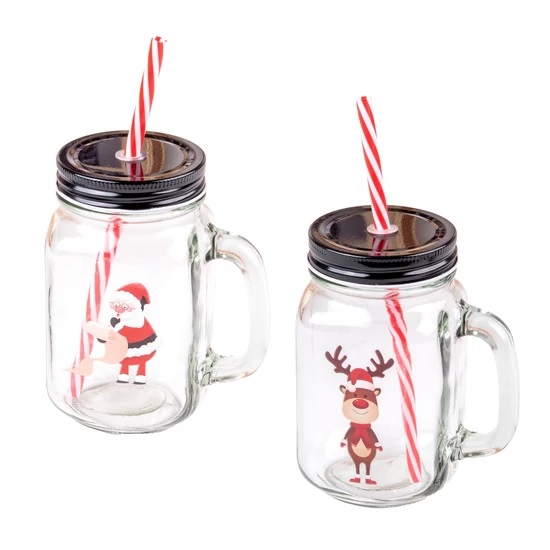 Cană de Crăciun din sticlă cu pai și capac metalic, 450 ml