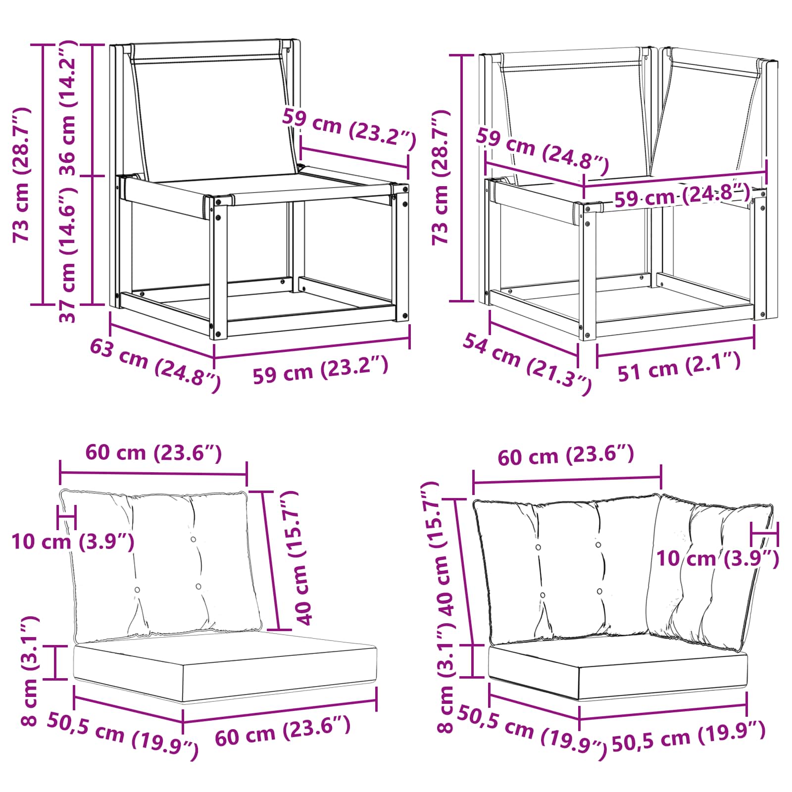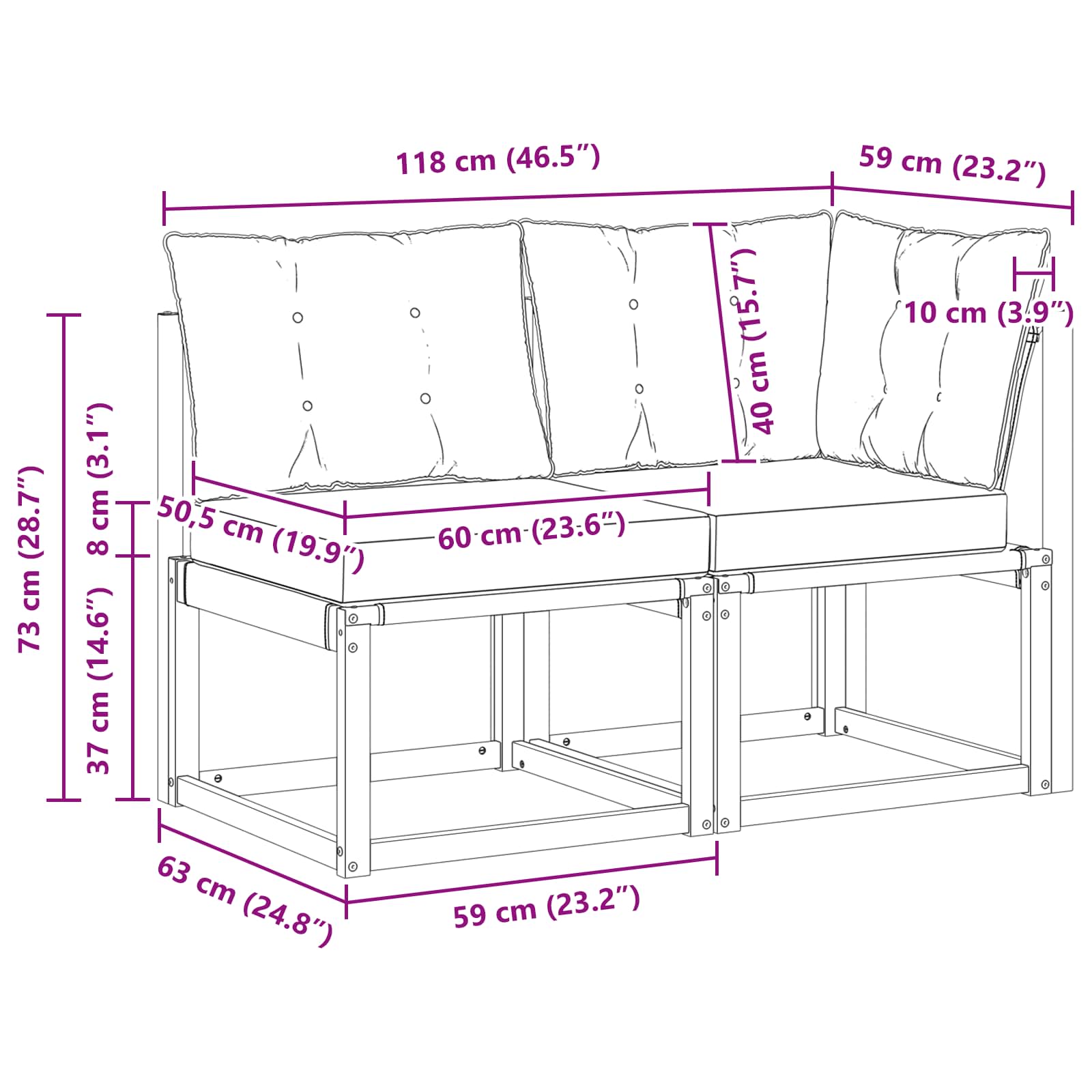 - 1 x Canapea mijlocie: 59 x 63 x 73 cm (LxWxH)