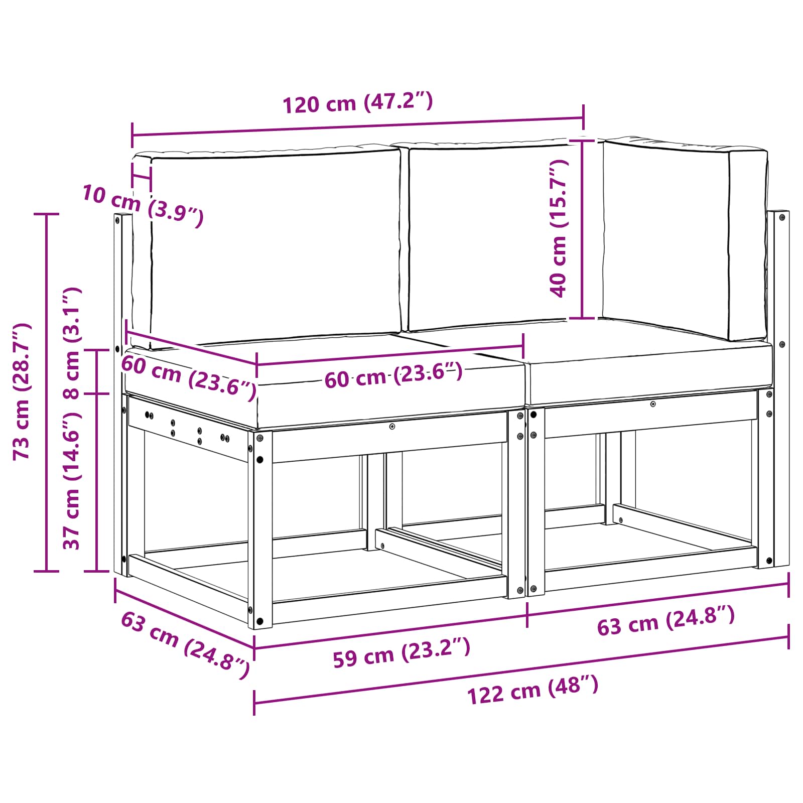 - 2 x Perne pentru șezut: 60 x 60 x 8 cm (LxWxH)
