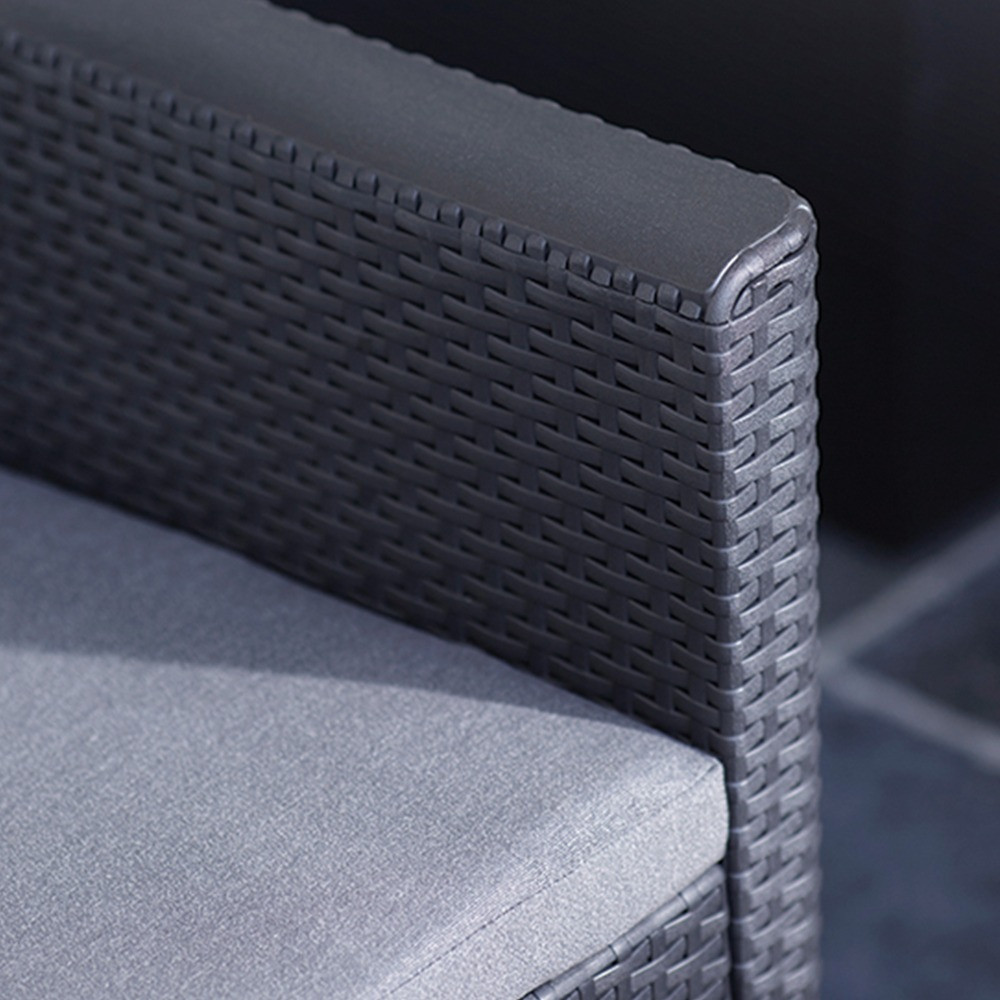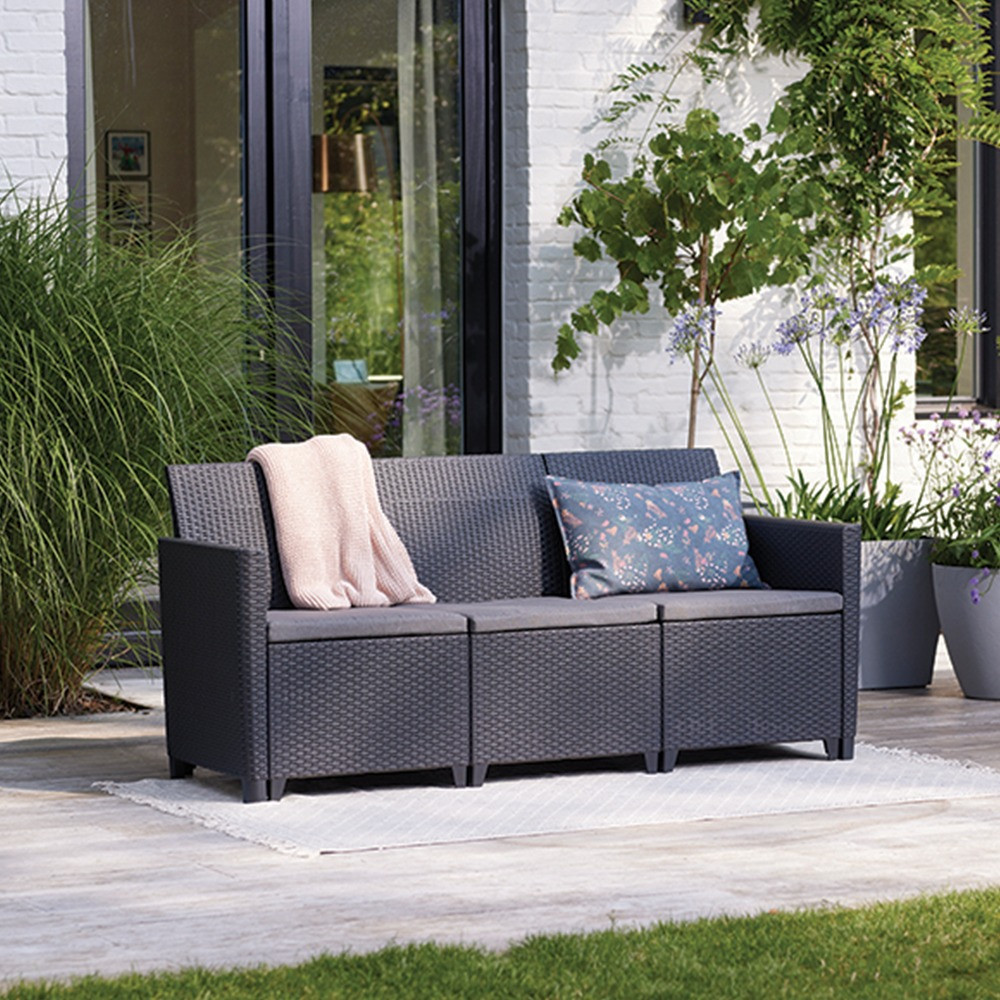 Transformă terasa sau grădina într-un loc de relaxare cu canapeaua Curver Claire cu 3 locuri, realizată din ratan sintetic în nuanță grafit. Designul modern, textura tip ratan și pernele incluse oferă confort plăcut la cafea, citit sau seri cu prietenii, iar materialul este gândit pentru utilizare la exterior.
