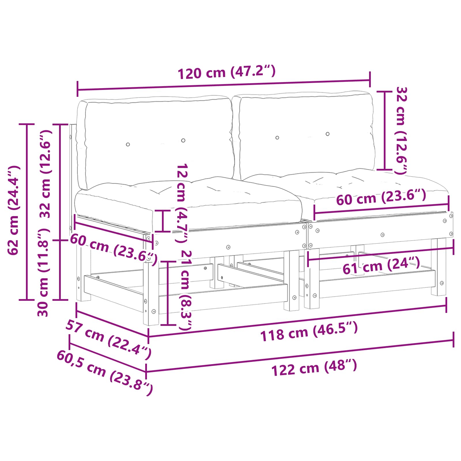 - 2 x Canapea de mijloc: 61 x 60,5 x 62 cm(L x l x h)