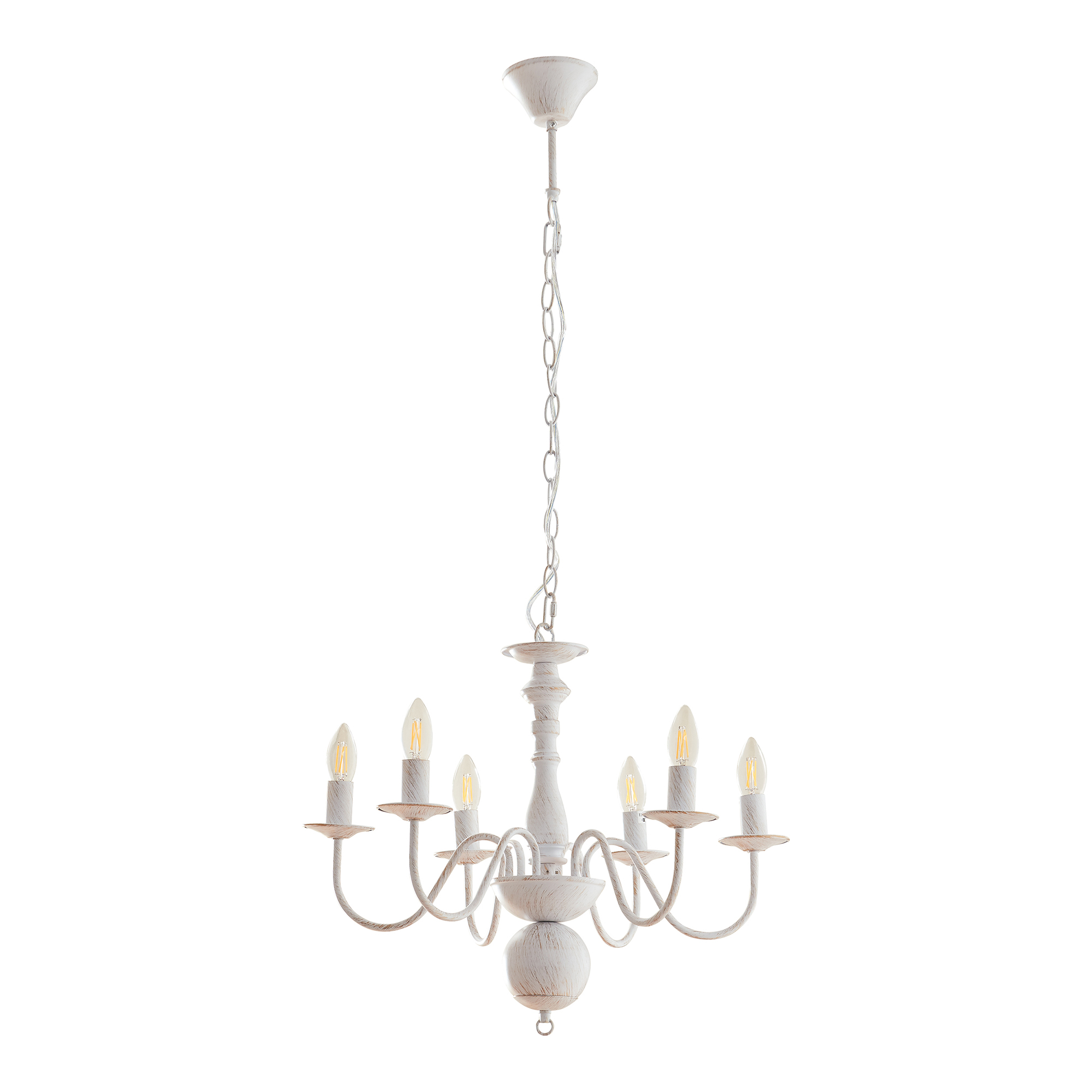 Designul său armonios, cu brațe curbe și detalii inspirate din stilul clasic, transformă ușor atmosfera încăperii. Poate fi folosit ca lustra vintage principală într-un spațiu de zi sau ca piesă de accent într-un interior luminos și primitor. În plus, montajul pe tavan este simplu, iar accesoriile necesare sunt incluse în pachet.