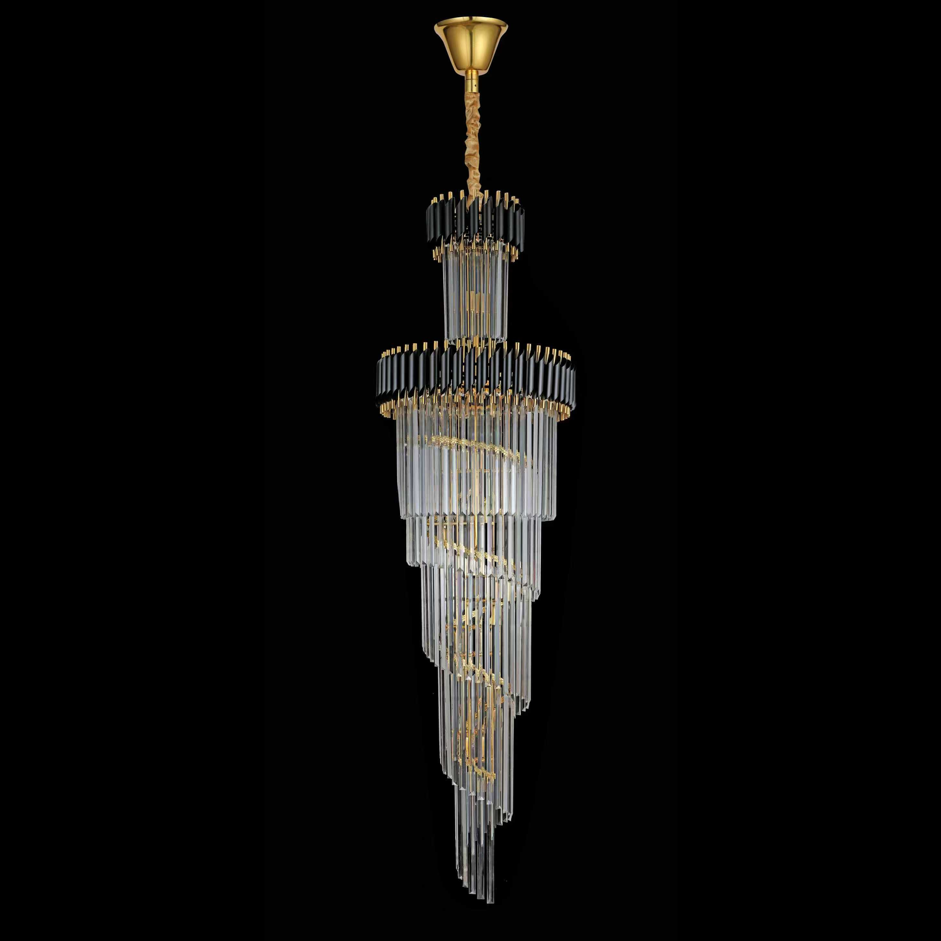 Transforma orice incapere intr-un spatiu premium cu acest candelabru din cristal CC900, creat pentru tavane inalte si interioare elegante. Combinatia de finisaj auriu lucios cu accente negre si sirurile de cristale ofera un efect spectaculos, iar cele 34 de socluri E14 asigura o iluminare ampla si rafinata.