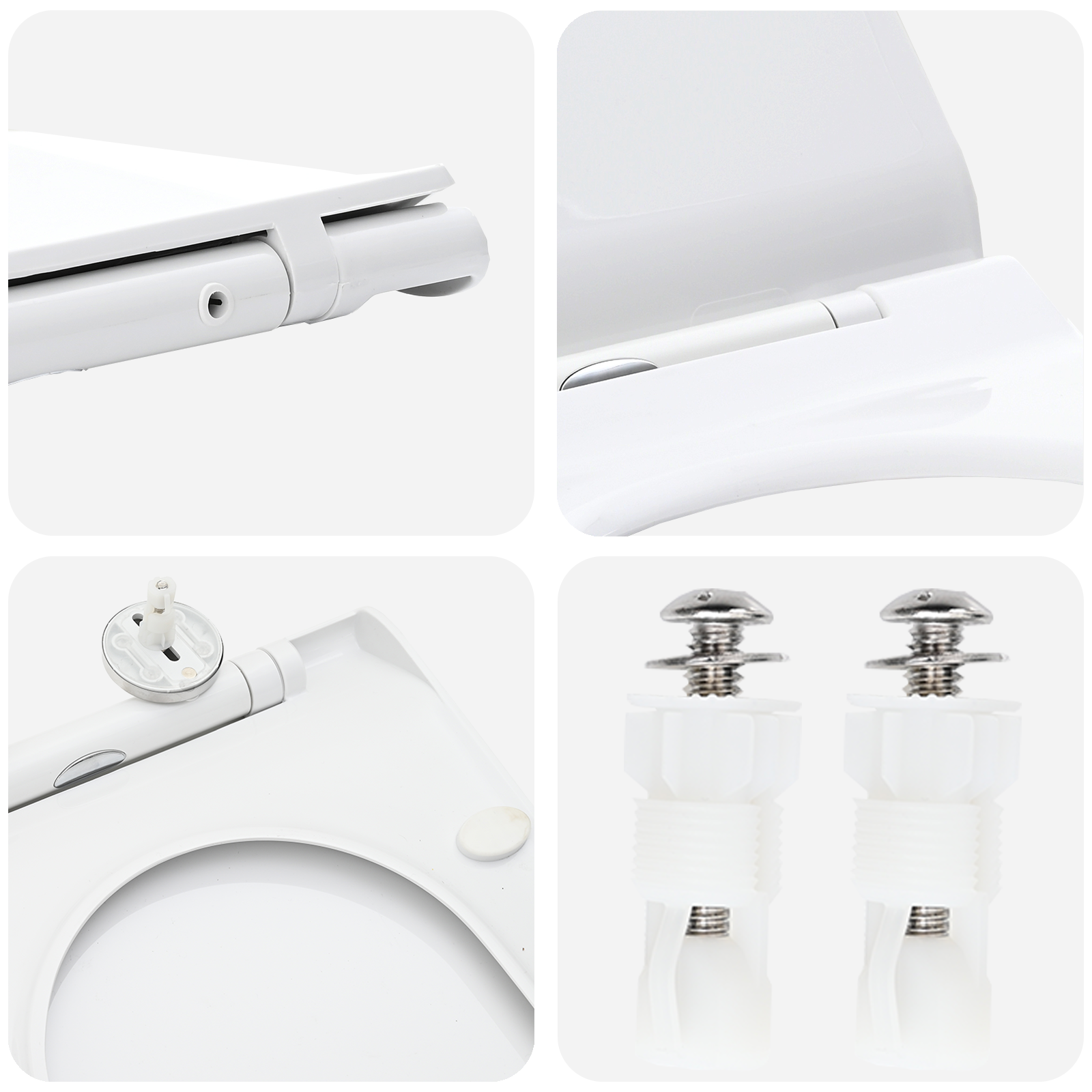 - Caracteristici / Funcționalitate / Design: Capac de toaletă are un mecanism de închidere lentă pentru a reduce zgomotele puternice, așa că e silențios în spații comune. Designul antibacterian diminuează germenii, sporind igiena în baia ta. Toate aceste trăsături sunt perfecte pentru cei care caută o funcționare lină și curățenie.