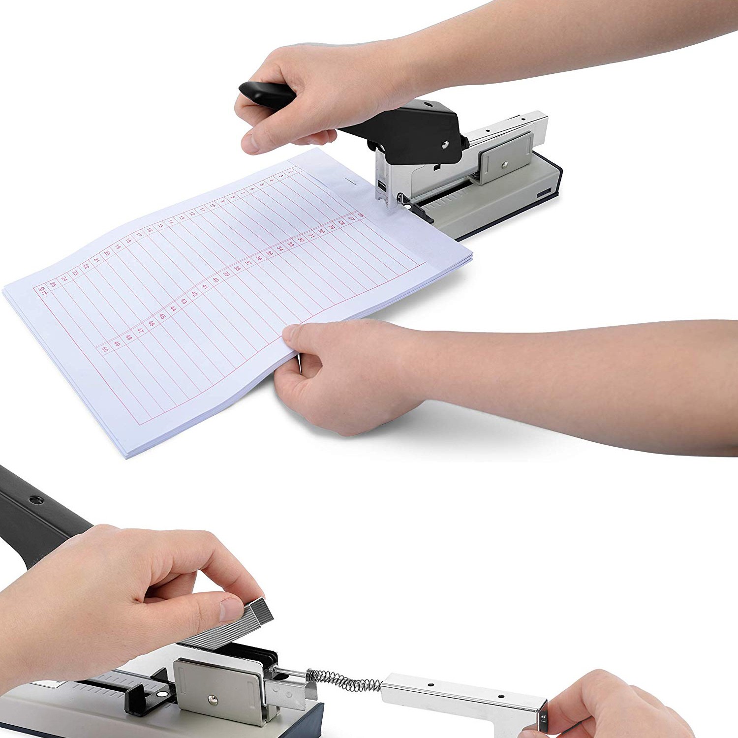 Acest capsator manual functioneaza cu capse 23/6, 23/8, 23/10 si 23/13. Capacitatea de capsare este in functie de marimea de capse utilizata, maximul fiind de 100 coli pentru capsele de 23/13.