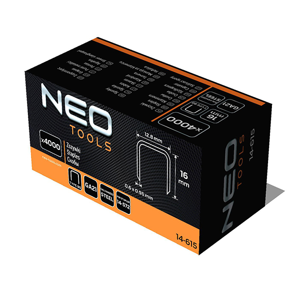 - Acest model de capse este recomandat pentru unealta marca NEO (14-572). - Pachetul contine pana la 4.000 de capse, ceea ce reprezinta o modalitate economica de a avea o rezerva mare de cartuse - ideal pentru profesionisti si meseriasi.