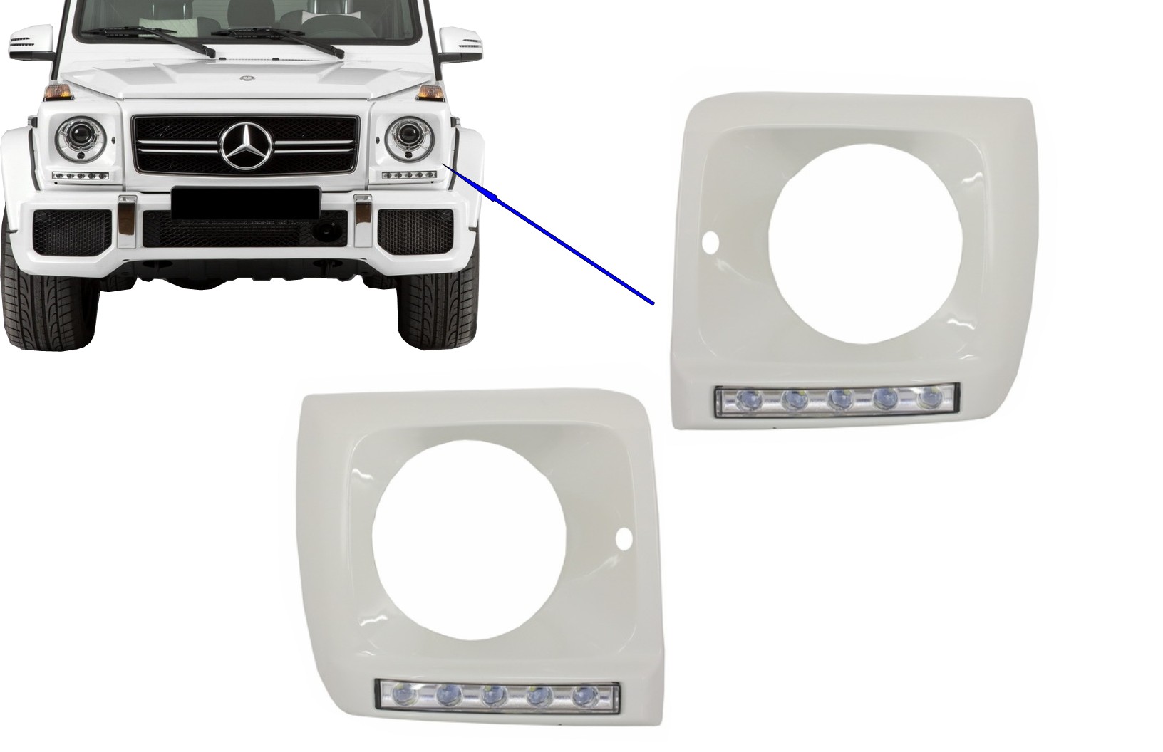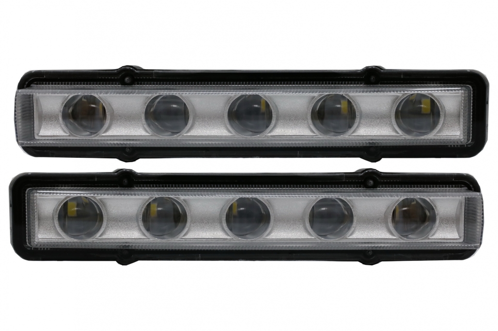 Ofera un plus de stil si vizibilitate cu aceasta carcasa faruri cu LED DRL, special conceputa pentru Mercedes G-Class W463 fabricat intre 1989 si 2012. Designul inspirat de versiunea G65 si finisajul alb cu insertii chrome contribuie la un aspect modern, elegant si bine integrat pe masina.