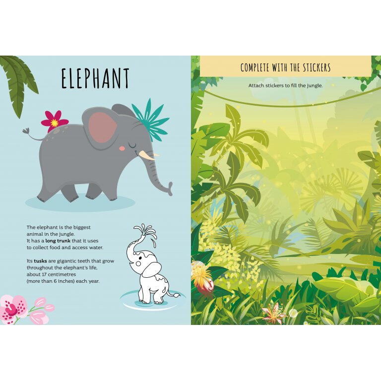 Descopera o carte de activitati cu abtibilduri plina de culoare, ideala pentru copiii curiosi care iubesc animalele exotice. Tema jungla transforma fiecare pagina intr-o aventura distractiva, cu exercitii care sustin creativitatea, atentia si coordonarea mana-ochi.