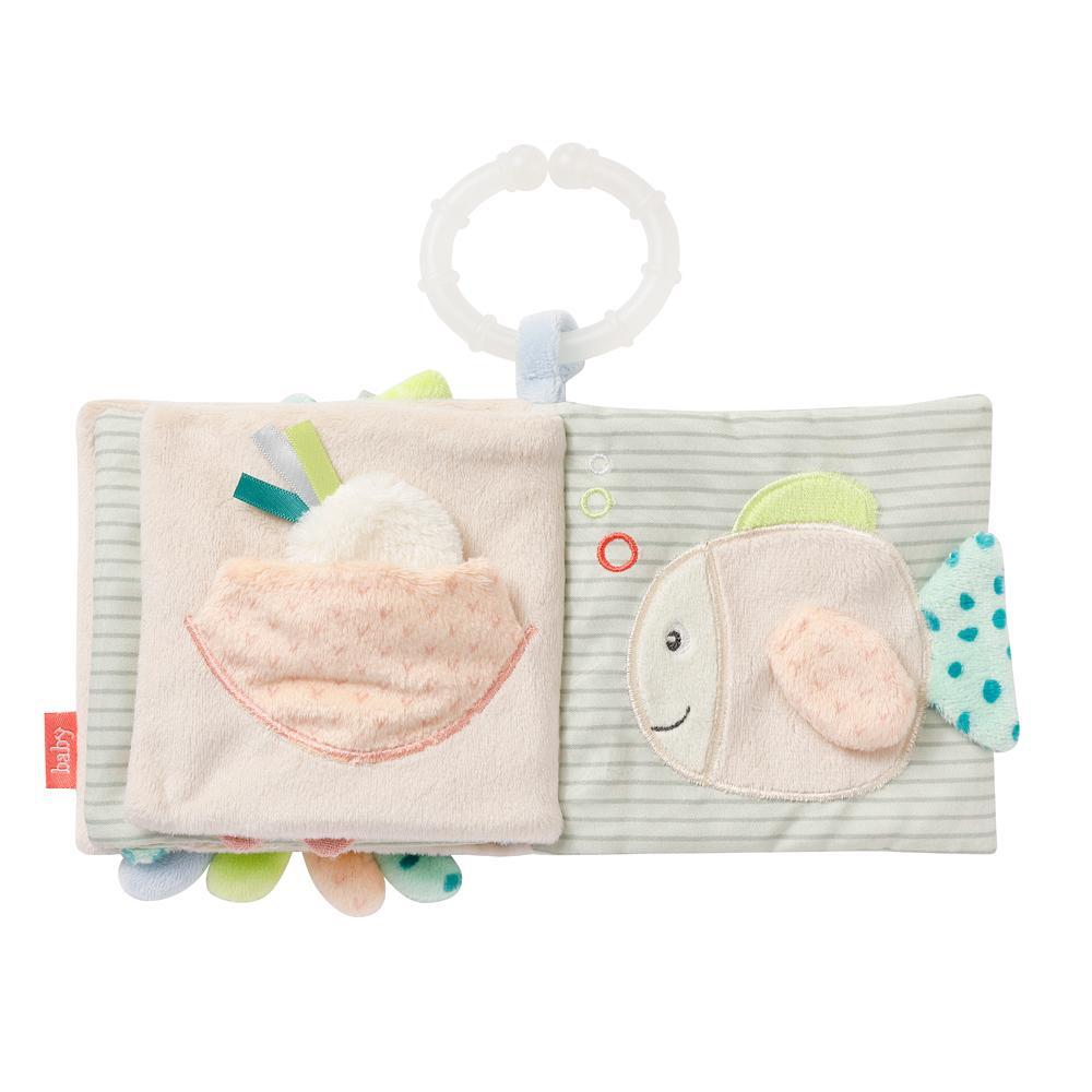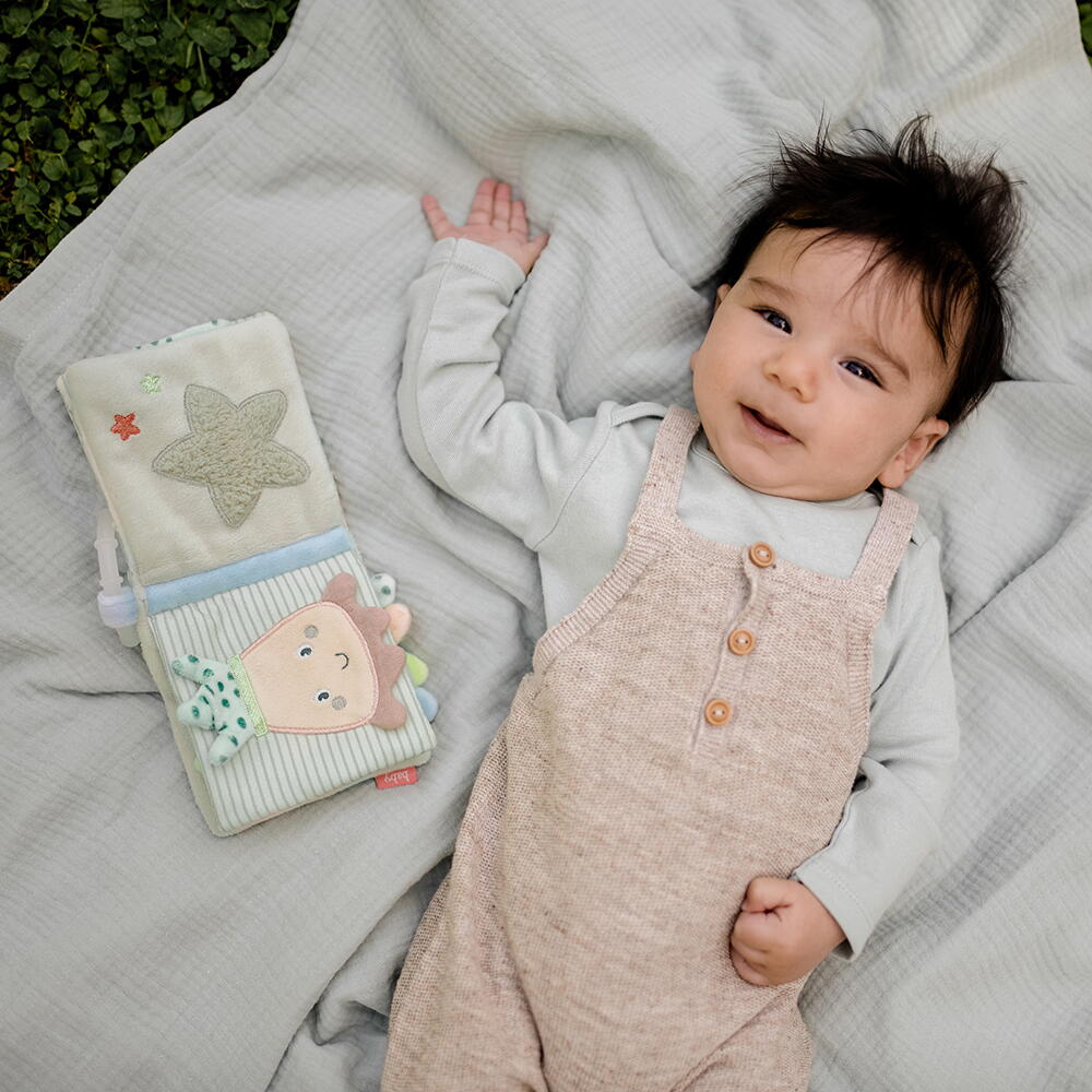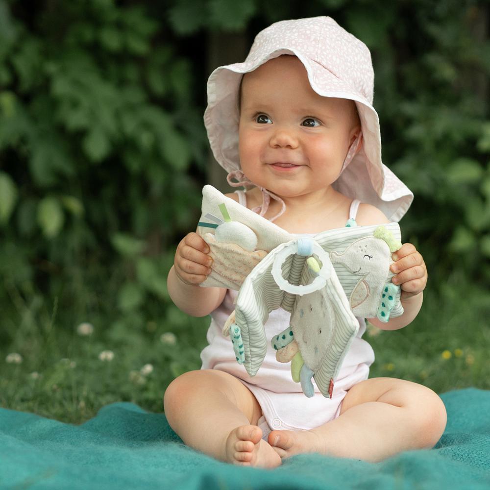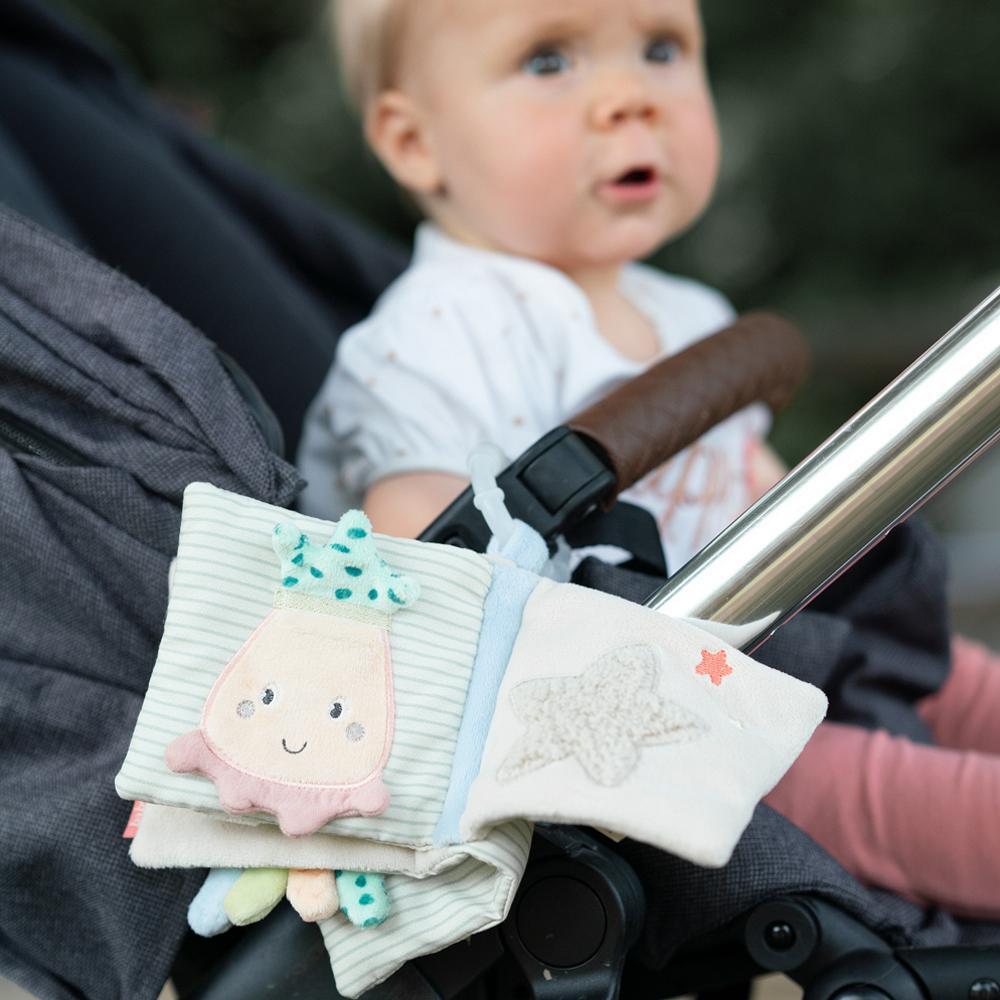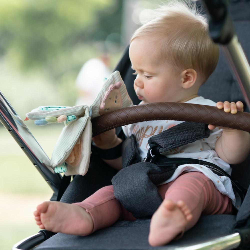 Micii exploratori vor descoperi pagini cu texturi diferite, efecte sonore precum sunet fosnitor și sunet chitait, dar și o oglindă ascunsă care le captează atenția și îi încurajează să se observe și să interacționeze. Inelul de prindere face ca această jucărie pentru cărucior sau mașină să fie ușor de atașat și mereu la îndemână.