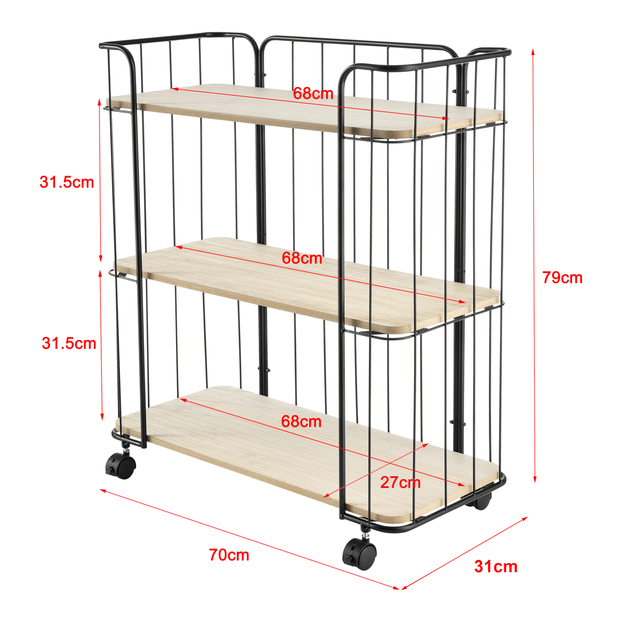 Datorită celor 4 roți din plastic, dintre care 2 sunt prevăzute cu sistem de blocare, căruciorul de servire se mută rapid și ușor acolo unde ai nevoie. Cele 3 etajere oferă spațiu bine organizat, iar structura din metal și polițele din MDF asigură un aspect plăcut și o utilizare practică în fiecare zi.