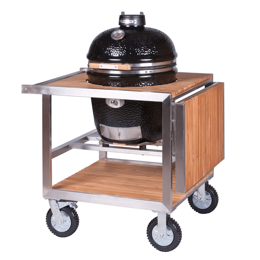 Un cadru din inox cu lemn de tec oferă micilor vedete ale familiei Monolith Grill o bază mobilă elegantă. În partea din spate există un suport convenabil pentru placa de foc asortată, astfel încât aceasta este întotdeauna la bord și are propriul loc de depozitare dedicat. Pe nivelul inferior de depozitare există suficient spațiu pentru alte accesorii.