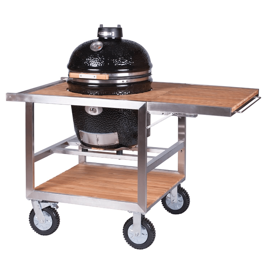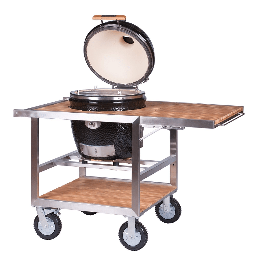 Un cadru din inox cu lemn de tec oferă micilor vedete ale familiei Monolith Grill o bază mobilă elegantă. În partea din spate există un suport convenabil pentru placa de foc asortată, astfel încât aceasta este întotdeauna la bord și are propriul loc de depozitare dedicat. Pe nivelul inferior de depozitare există suficient spațiu pentru alte accesorii.